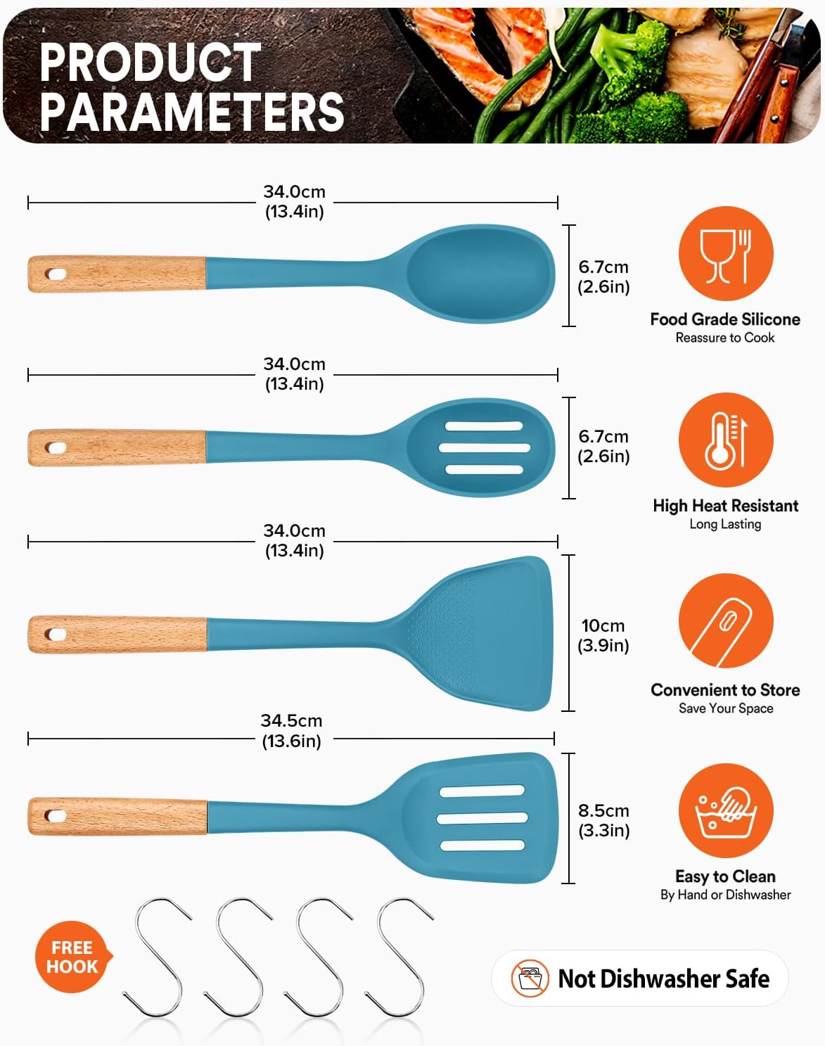 Silicone Cooking Utensils Set, Perfectly Angled for Frying, Mixing,Serving,Draining,Turning and Stirring, BPA-Free Matte Silicone, Wood Handles, Safe for Nonstick Cooking Surfaces,4 Pack (Blue)