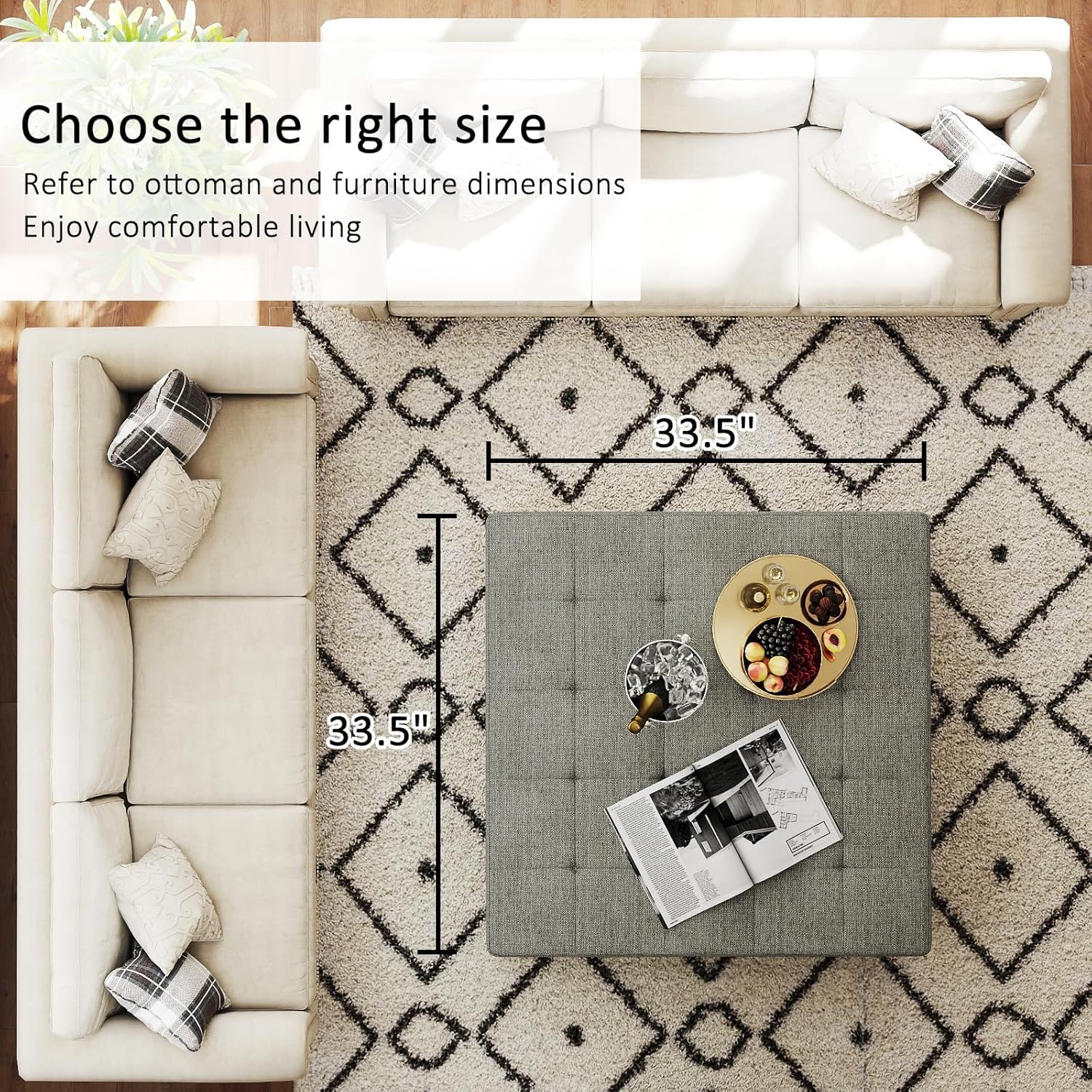Large Square Ottoman Coffee Table, Linen Solid Upholstered Footrest Ottoman with Solid Wood Shelf Storage Tufted Coffee Table for Bedroom Living Room, Granite