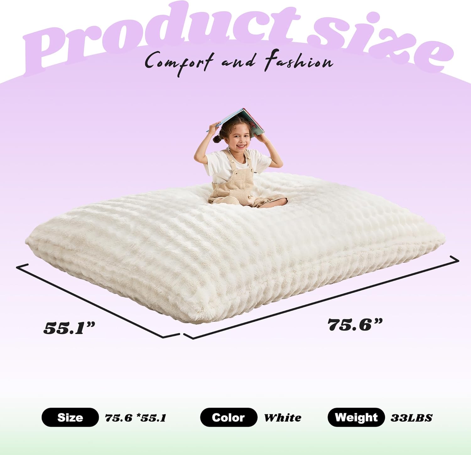 - Memory Foam Bean Bag Chair: The 3-in-1 giant bean bag chair stands out with its high-density memory foam filling, it can bounce back quickly, not only provide comfort but also support. The thickness of the bean bag is up to knees when you lay it down flat.