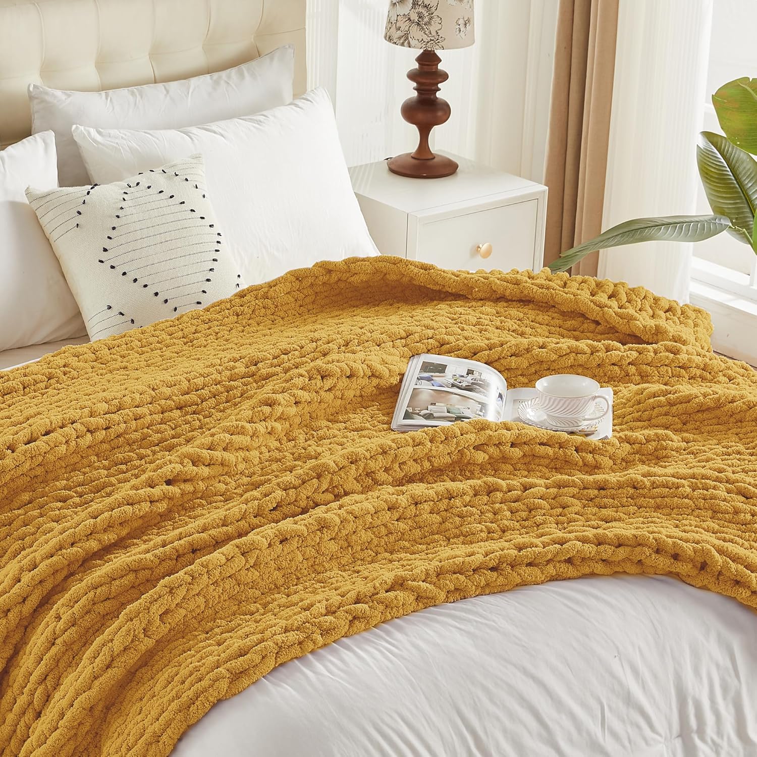 Carriediosa Chunky Knit Throw Blanket 60" X 80" Twin, 100% Hand Made Large Chenille Loop Yarn Soft Fluffy Throws for Couch Sofa Bed, Big Crochet Cozy Heavy Thick Cable Woven Blanket, Yellow