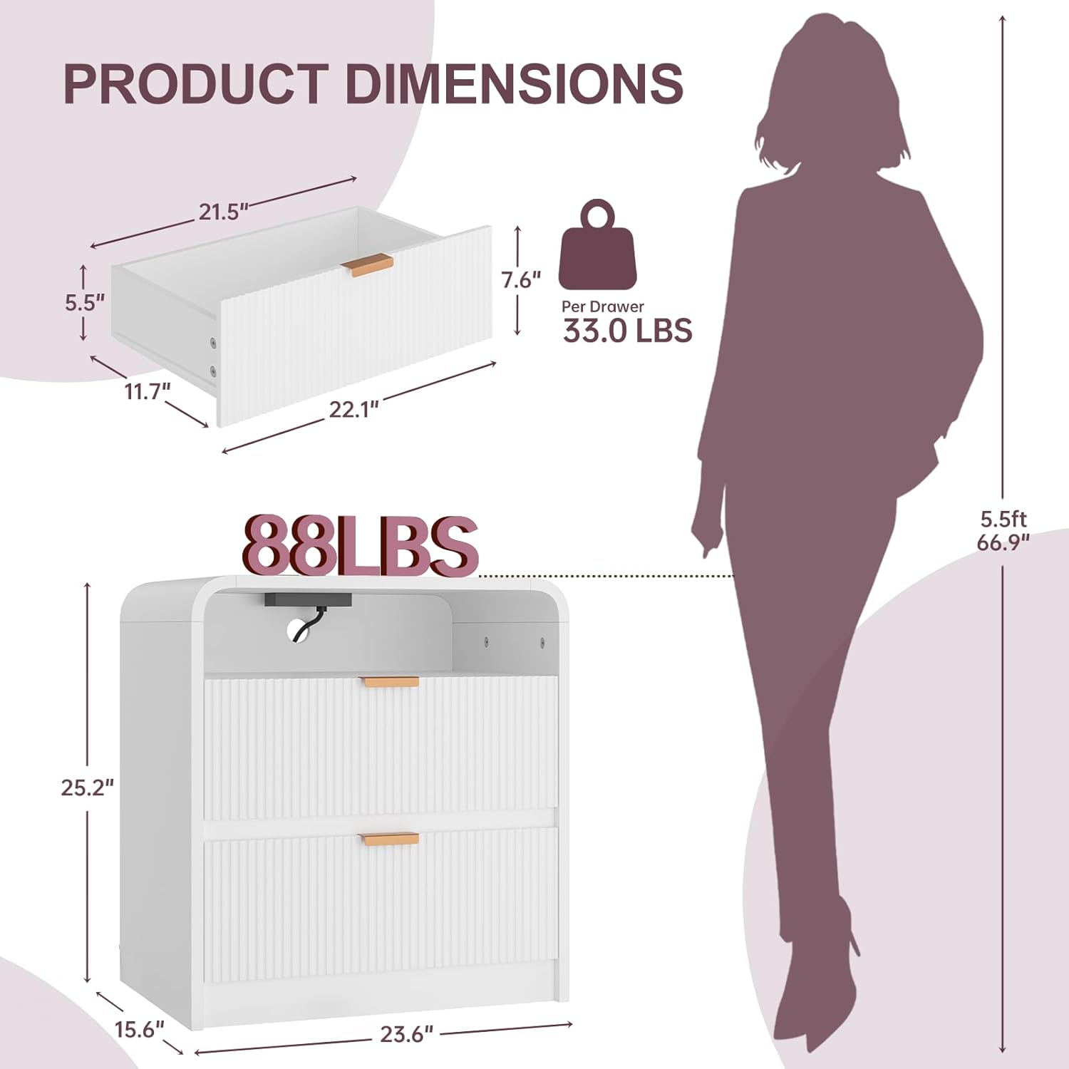 FURSUN 24" Fluted Nightstand with Charging Station, Wooden End Table with 2 Drawers Storage, Curved Profile Design, Modern Bedside Cabinet for Bedroom Living Room, White