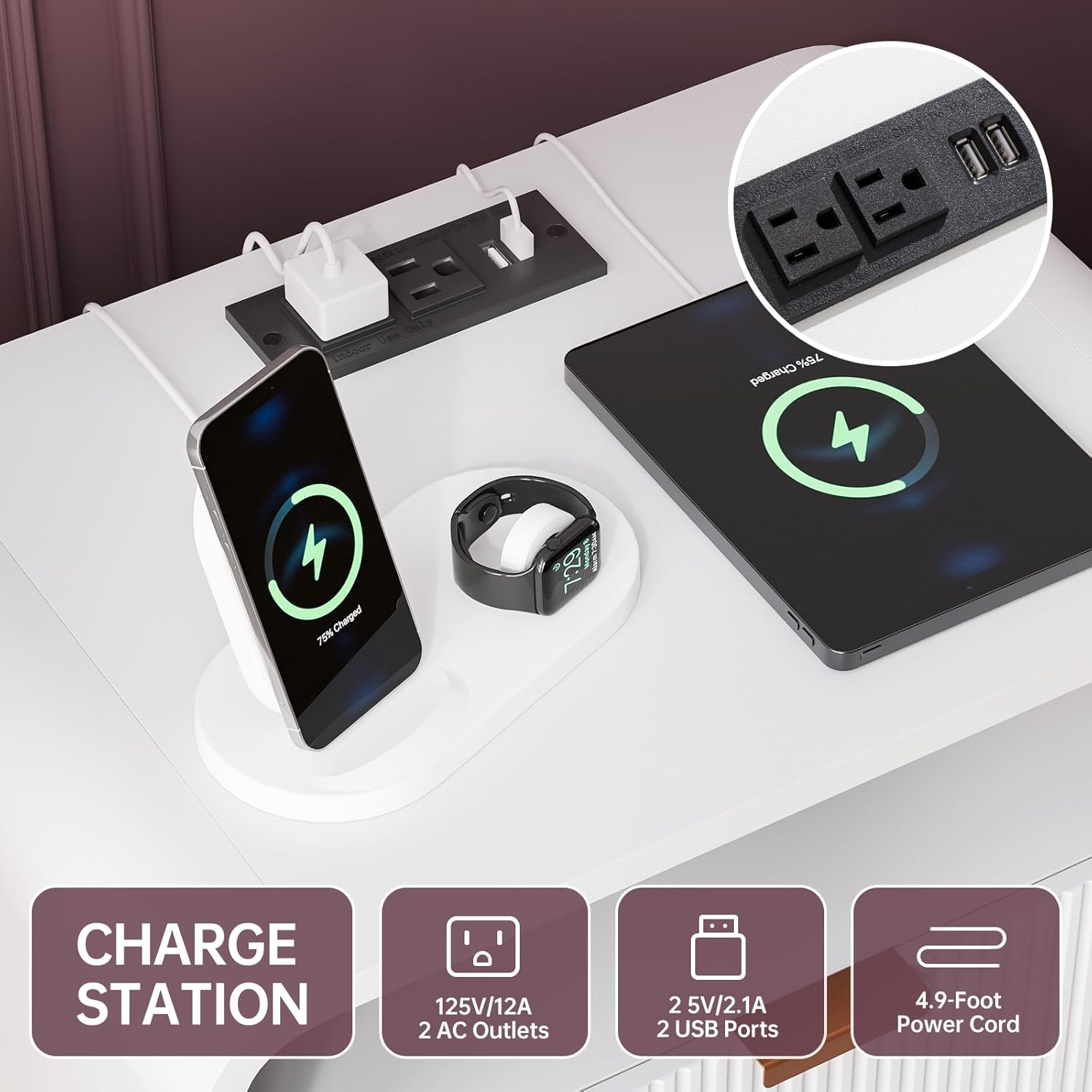 - ăVersatile Nightstand with Charging StationăBedside Cabinet with 2 AC outlets & 2 USB ports conveniently located along the top, this nightstand has your charging needs covered. Measuring 24"W Ă 15.5"D Ă 25"H, brings both function and flair to your home organization. The top surface for staging framed photos, artful accents, and more.