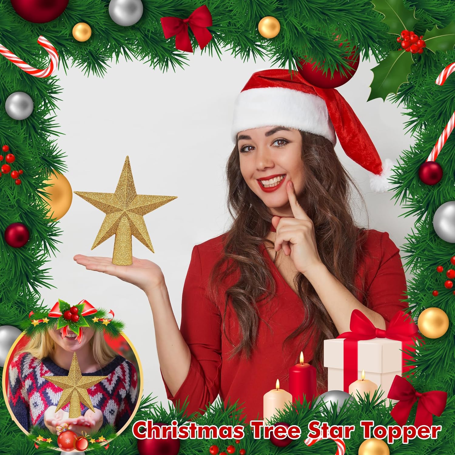 - Elegant Metallic Gold Star – Crafted in a classic five-pointed shape with shimmering sequins, this golden tree topper adds a touch of luxury and festive sparkle