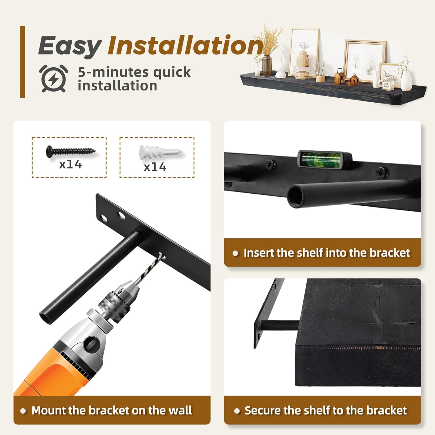 - Hidden Bracket Installation: Includes secure hidden steel brackets for a clean floating look. These easy-to-install shelves provide stability and a sleek, minimalist appearance