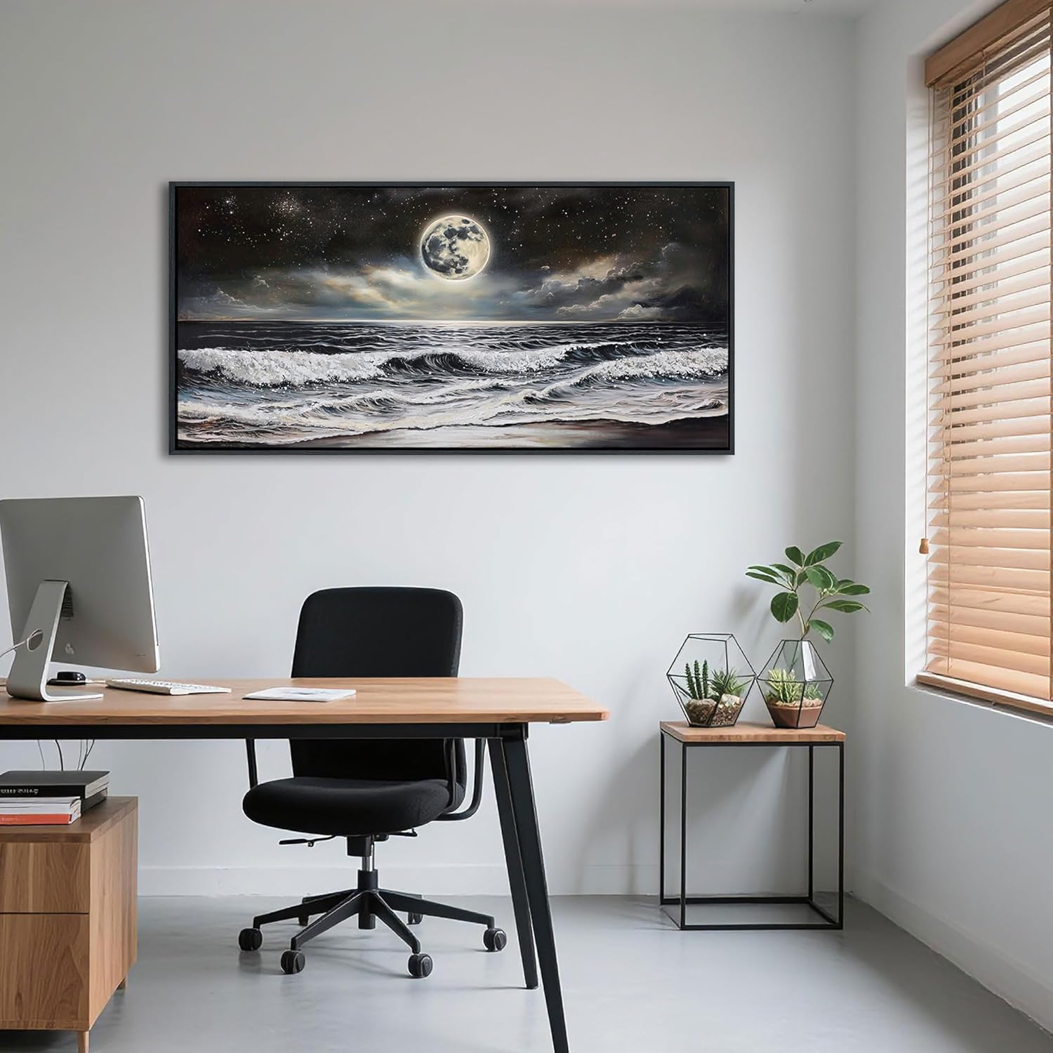 QZQCBLC Large Black Ocean Wall Art, White Sea Waves Moon Starry Clouds Canvas Print Paintings Artwork Beach Landscape Pictures for Living room Bedroom Home Office Wall Pictures Decor 24x48 IN
