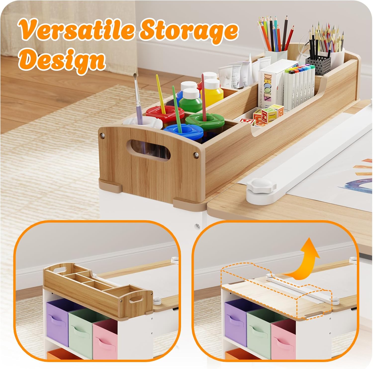 Kids Art Table and Chair - Toddler Craft Table and Chairs Set with 2 Chair & Bins, Kids Activity Desk with Paper Roll for Playrooms & Classroom, 44" L x 24" W, Natural