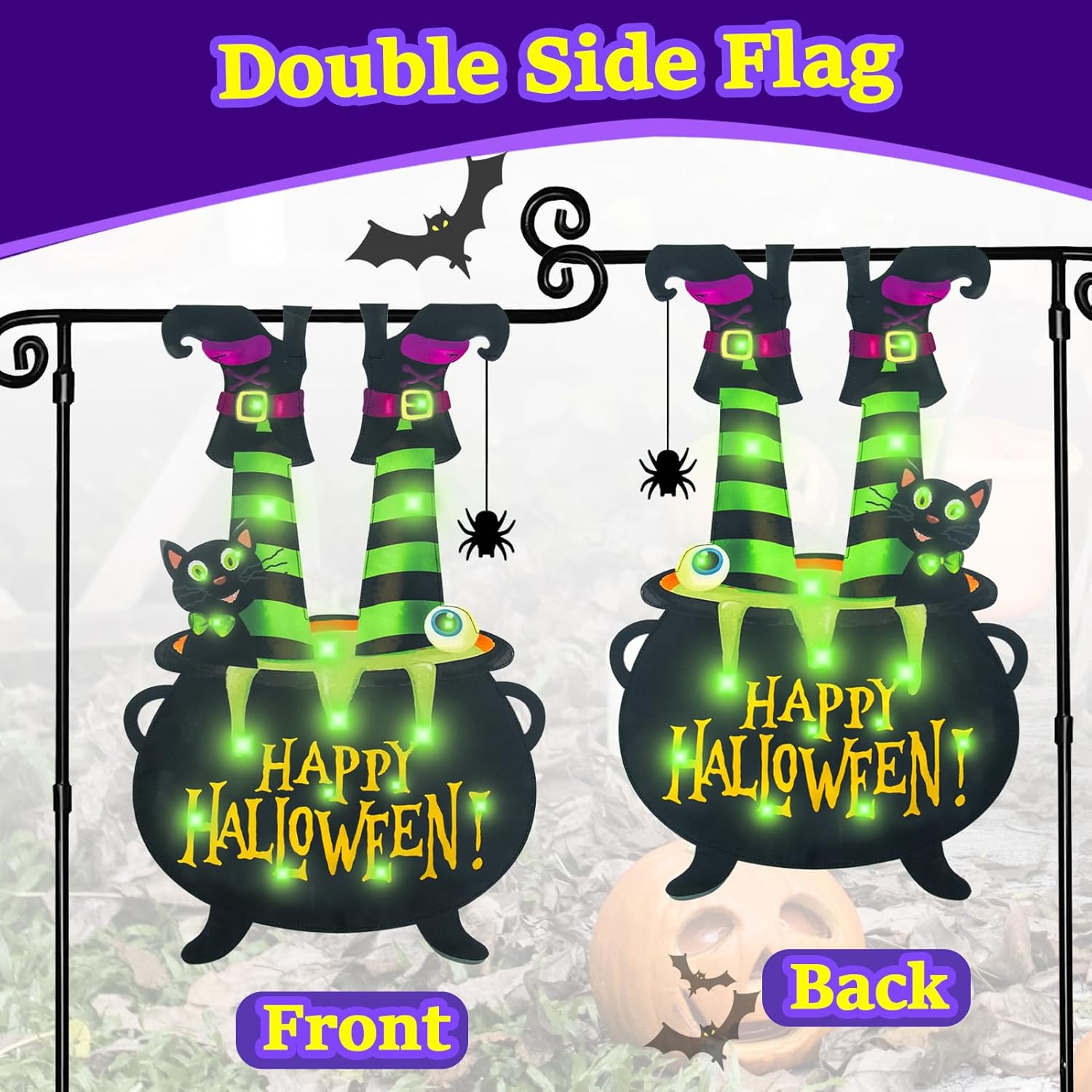 Halloween Lighted Garden Flag for Outside, Witch Feet Shape Flag Yard Decor, 8 Modes Double Sided Cauldron Eyeball Black Cat Outdoor Hlloween Decorations for Home Porch (Green-28x40)