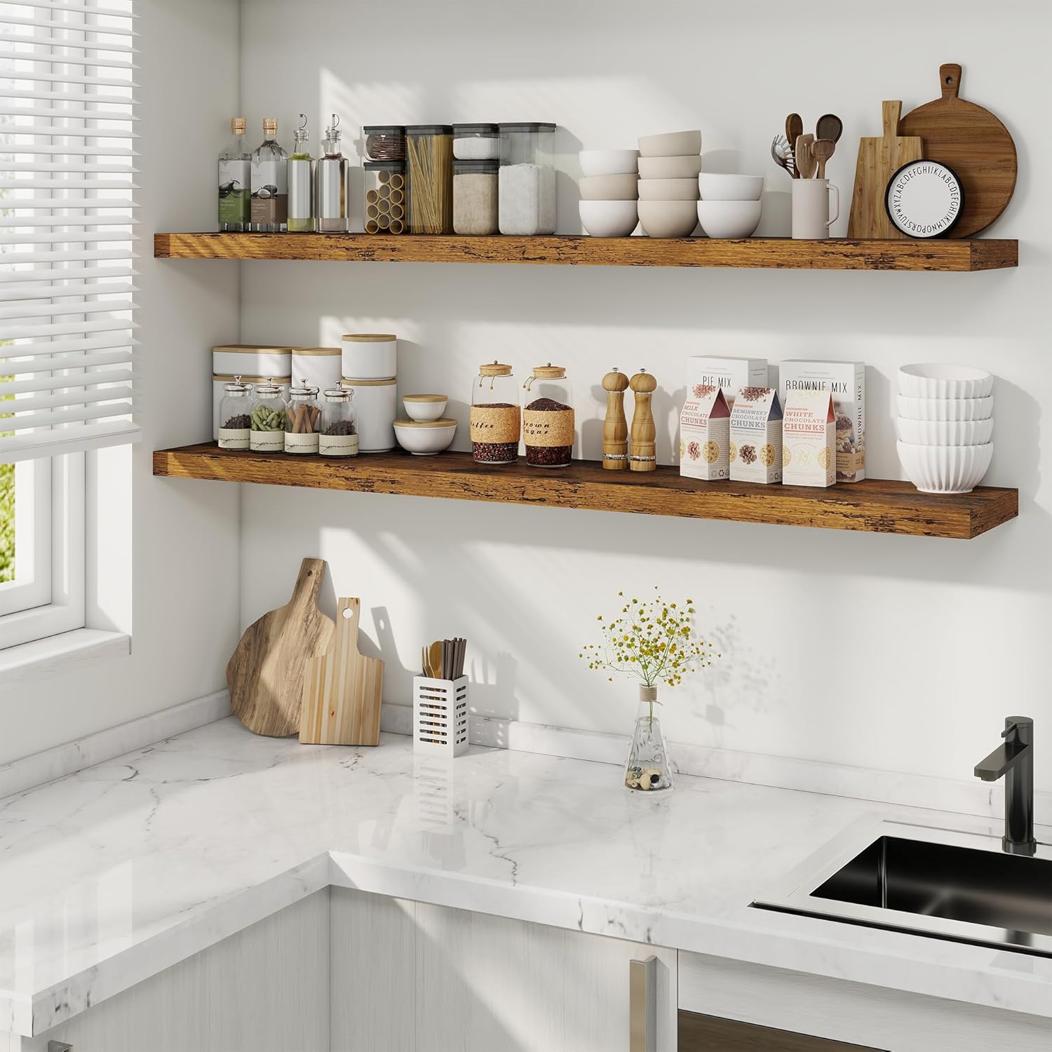 - Effortless Installation: Upgraded hidden brackets ensure a sleek, gap-free look with included tools (magnetic level, anchors, screws) for quick mounting in under 5 minutes. Combines rustic charm with modern stability
