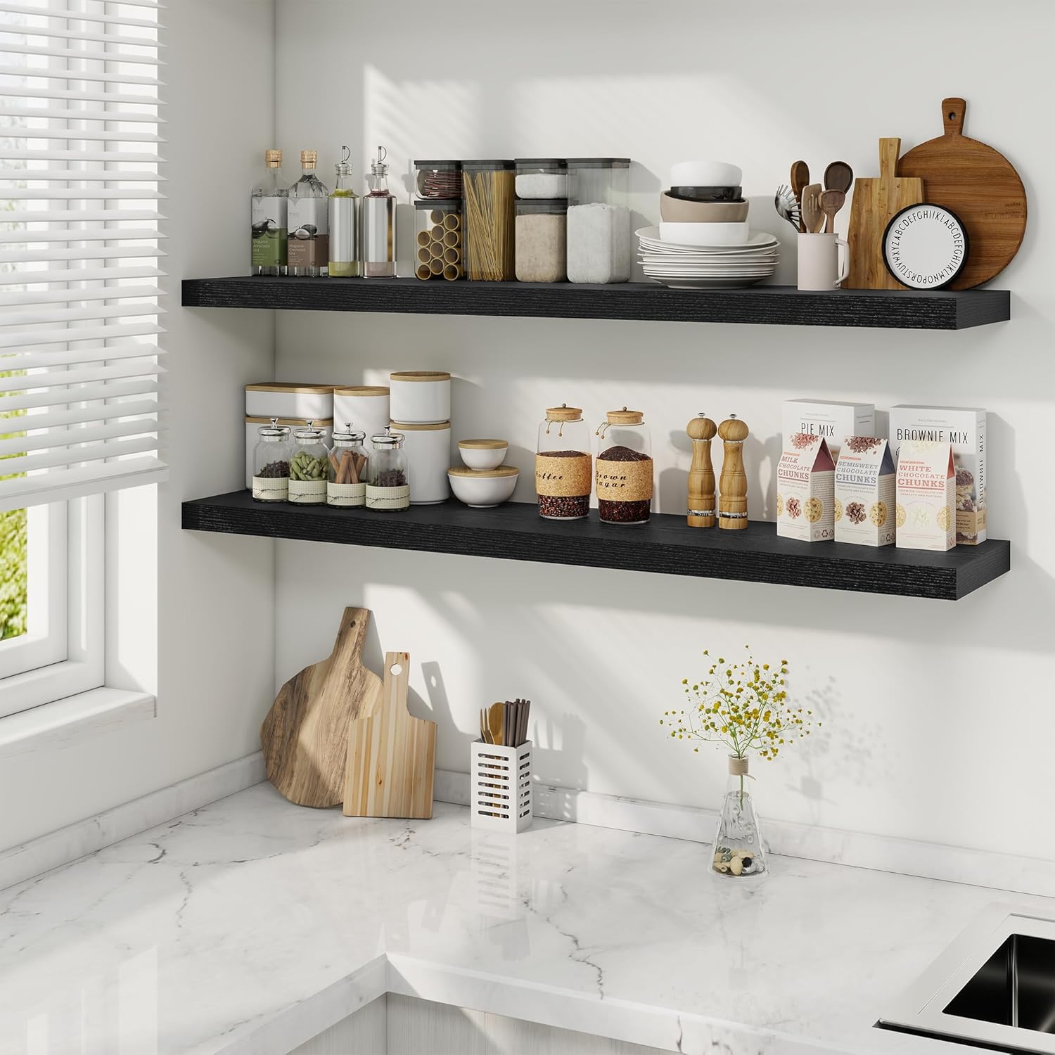 Fun Memories 48 Inch Deep Floating Shelves for Wall, 2 Pack of Long Wall Mounted Wood Shelves with Invisible Brackets for Bathroom, Bedroom, Living Room, Kitchen Decor and Storage, Black