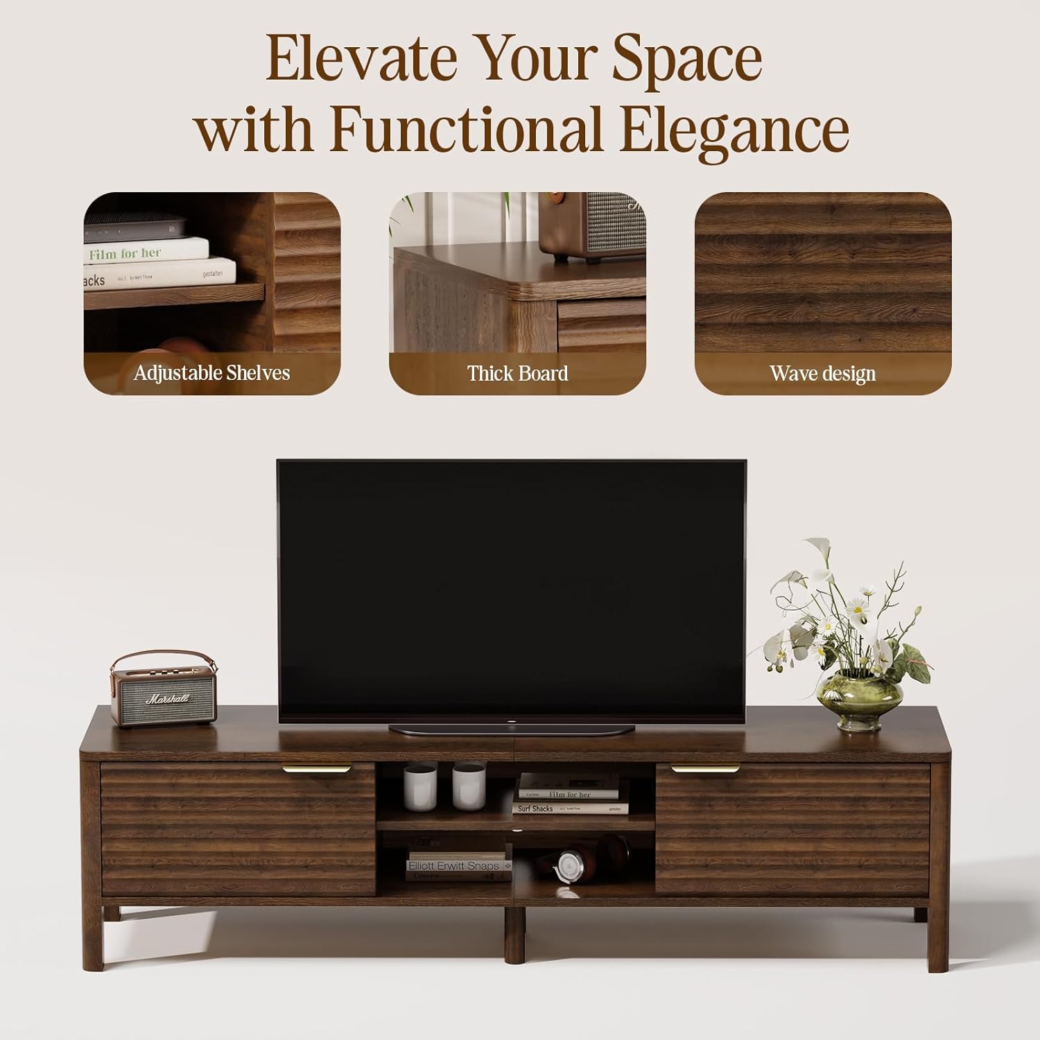 - Elevate Your Space: This 59" TV stand blends mid-century modern style with functional design. Features elegant fluted swing doors and curved legs for a sleek look in any living room or bedroom