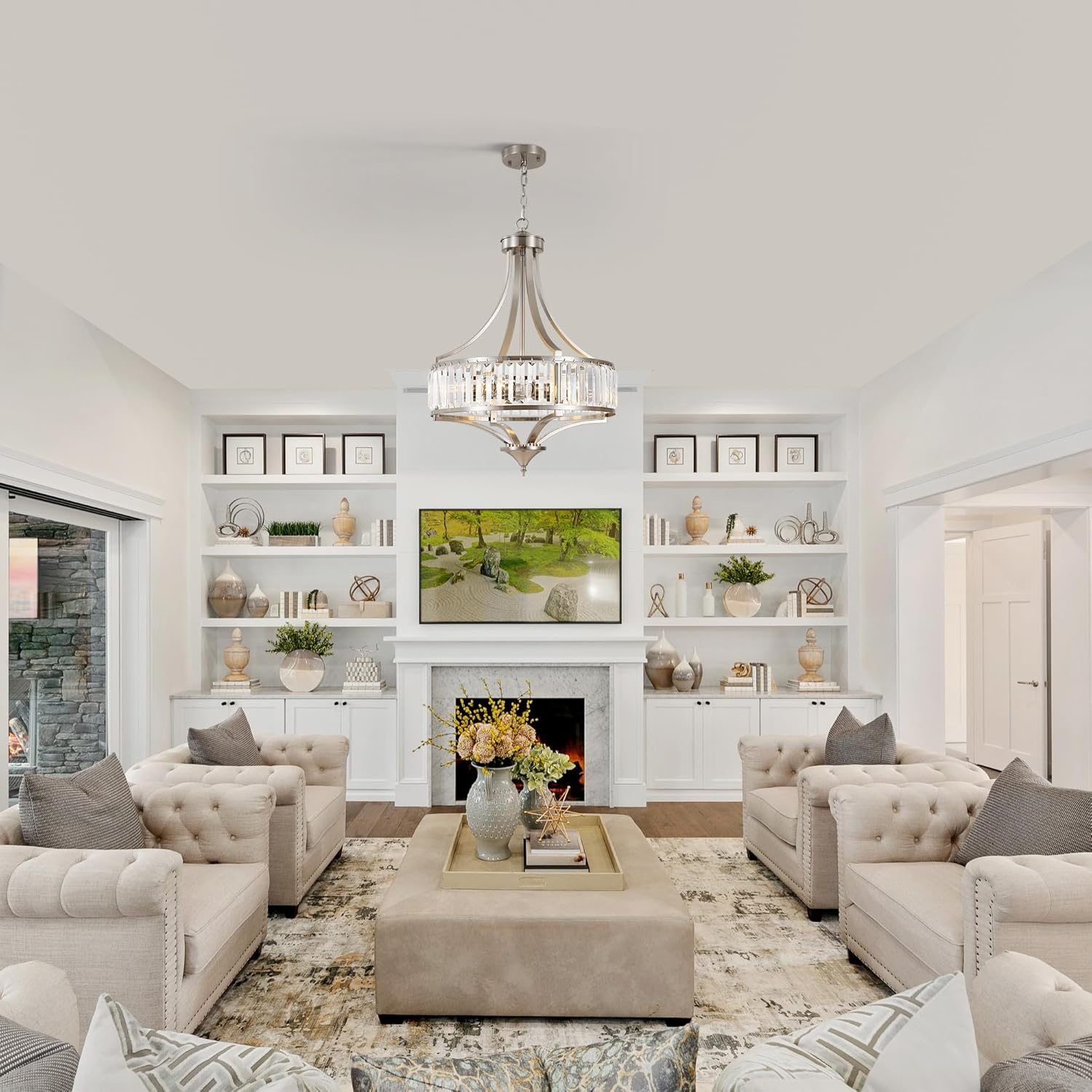 - Modern Farmhouse Style: Brushed nickel crystal chandelier is crafted by skillful artisans. The crystal strips in the main part are skillfully arranged to form an elegant circular structure. Whether it is in the common living room where you spend time with your loved ones, the dining room where you enjoy cooked meals, the chic chandelier fits right in to light up every moment spent inside the comfort of your home.