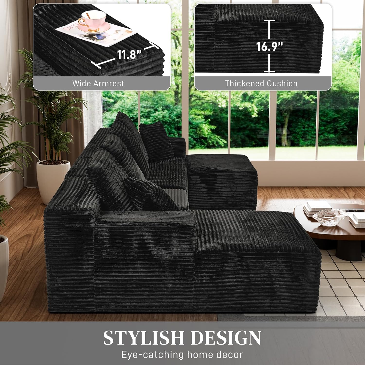 Modular Sectional Sofa Cloud Sectional Couch, 135" Comfy Fluffy U Shaped Black Couches for Living Room, Deep Seat Memory Foam Plush Corduroy Boneless Couch Sectionals with Left Facing Chaise Sofa