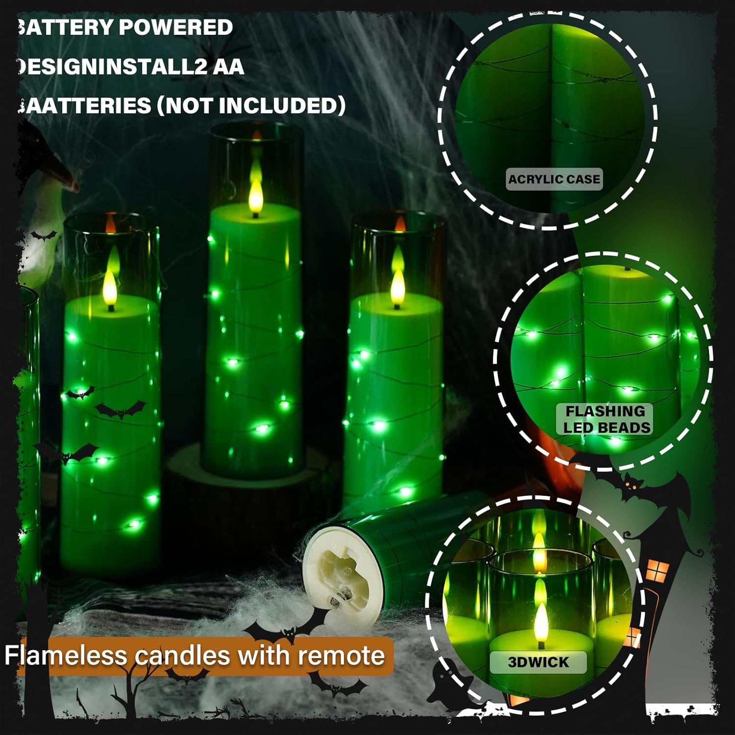 Flickering Flameless LED Candles,Battery Operated Candles 9 Pcs with Embedded Star String,Acrylic LED Pillar Candles with Remote,Suitable for Home Decoration to Create an Atmosphere (Green)