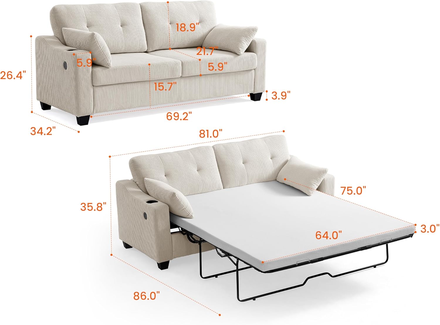 Pull Out Sofa Bed, Full Size Sleeper Sofa, 2-in-1 Convertible Corduroy Couch with USB Charging, Memory Form Couch for Living Room, Apartment and Small Space (Corduroy Beige, Queen Size)