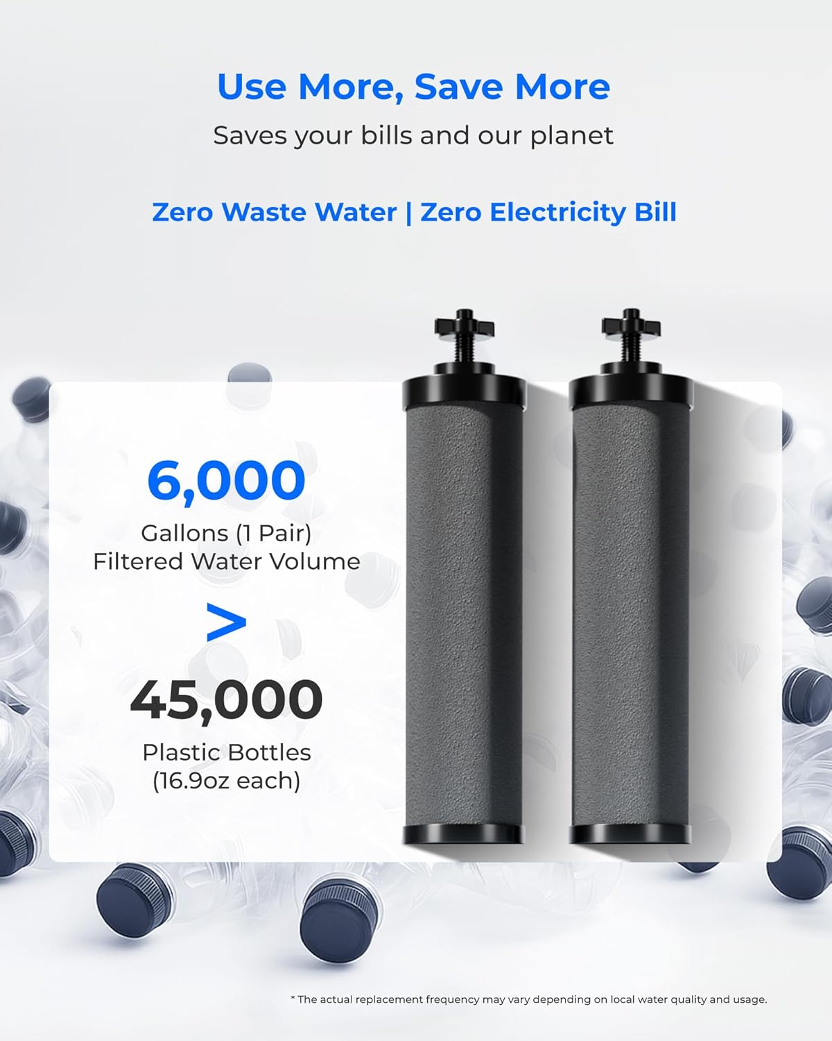 - Longer service life: The Black Carbon Filters can provide 6,000 gallons of fresh water. For better performance, we recommend that you replace the filter every 6,000 gallons per pair. However, this may vary depending on your water conditions.