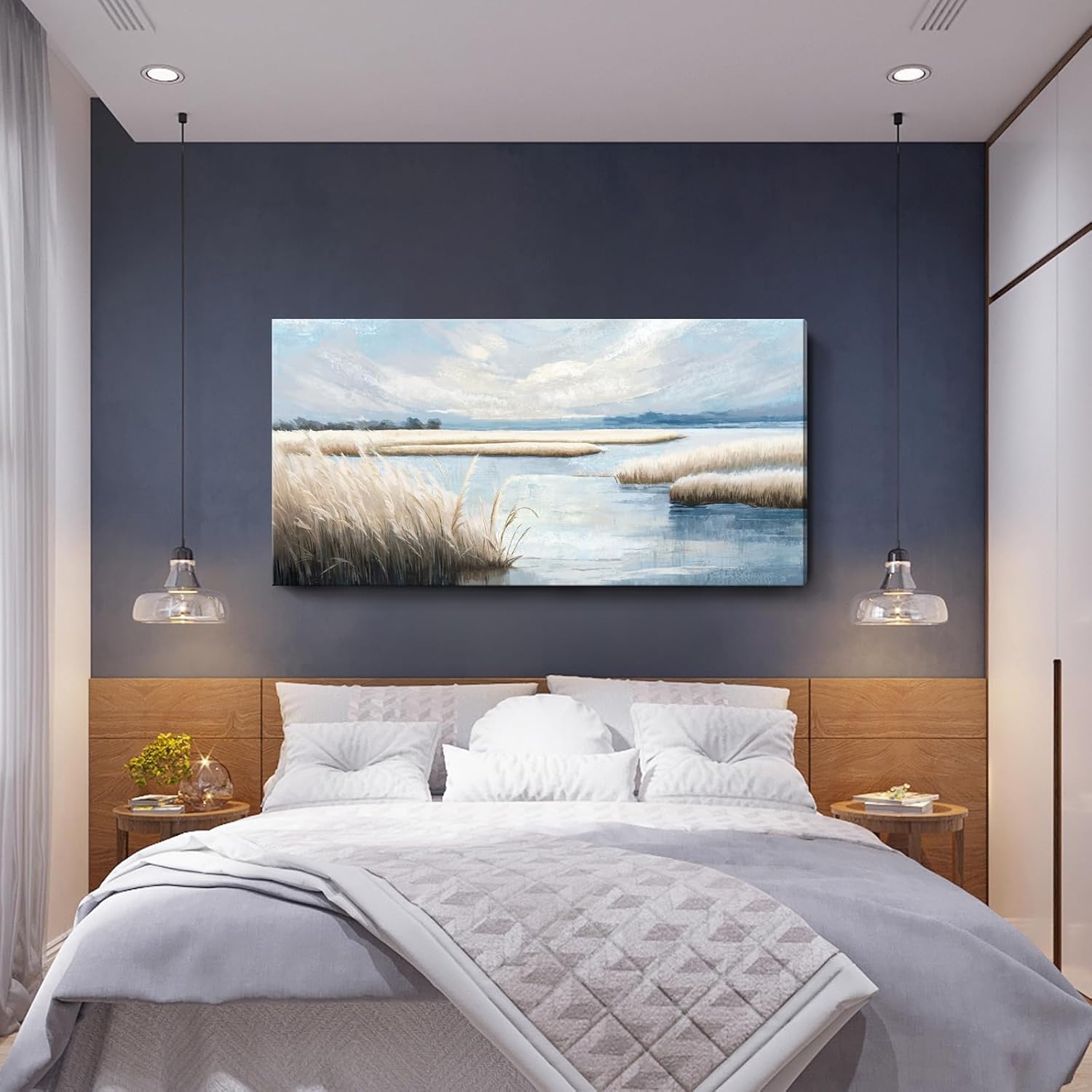 amatop Extra Large Coastal Marsh Landscape Wall Art – Neutral Blue Beige Wetland Canvas Print for Bedroom Living Room Office – Serene Nature Wall Decor,Oversized Ocean Artwork for Home Decoration