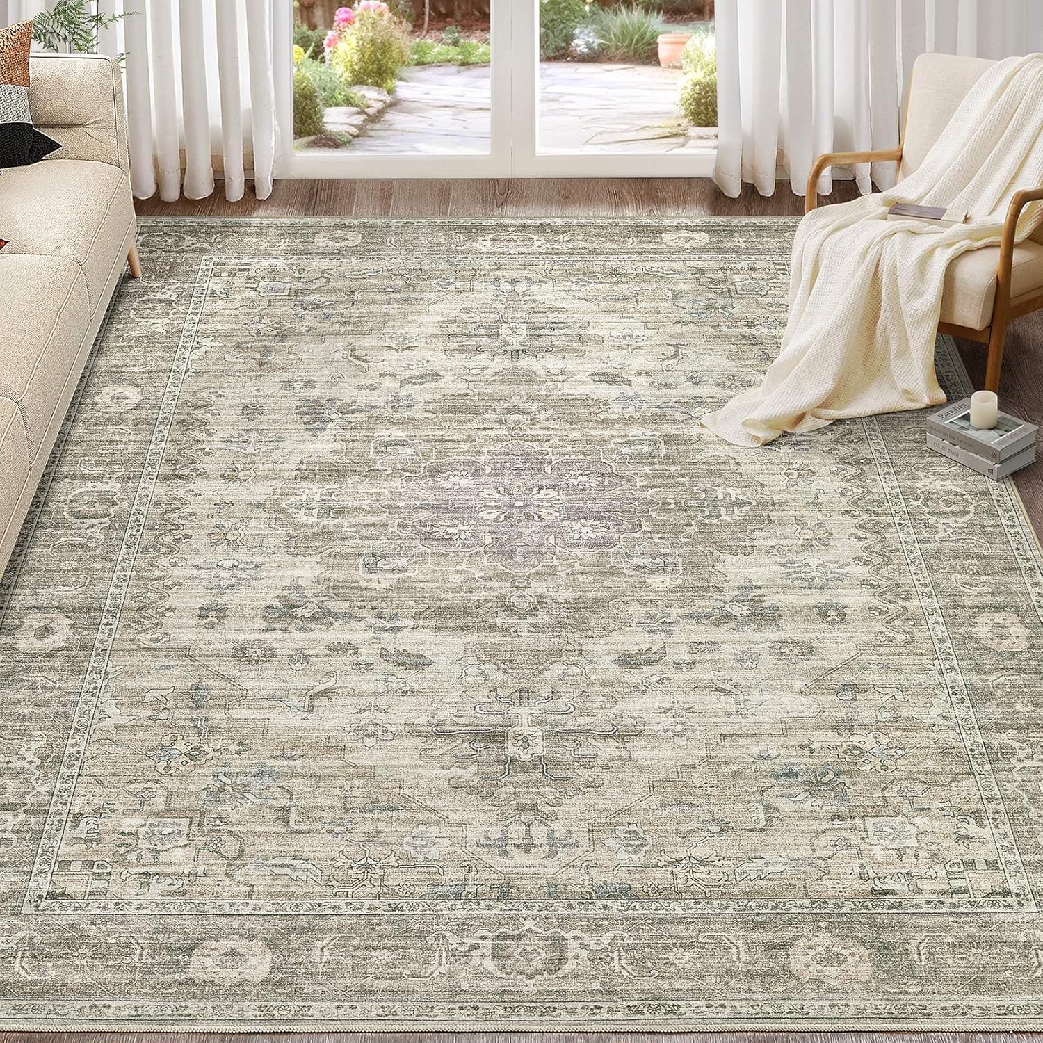 Washable Area Rugs for Living Room -8x10 Neutral Vintage Distressed Floral Farmhouse Boho Large Soft Floor Rug Indoor Non Slip Carpet for Living Room Bedroom Dining Room Office - Brown/Tan