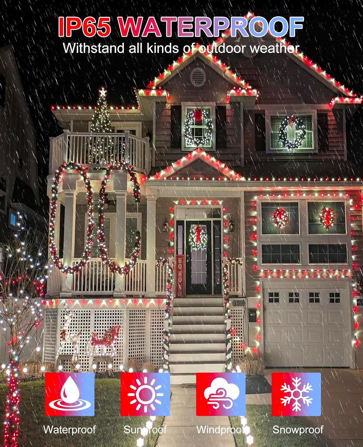 - 【IP65 Waterproof Outdoor Decoration】With IP65 waterproof design, the Christmas tree lights can work properly in windy, rainy and snowy weather, suitable for year-round use. Perfect for Christmas, Halloween, party, wedding, birthday, yard, roof, door, restaurant, shopping center, stage decorations. But please keep the adapter away from water.