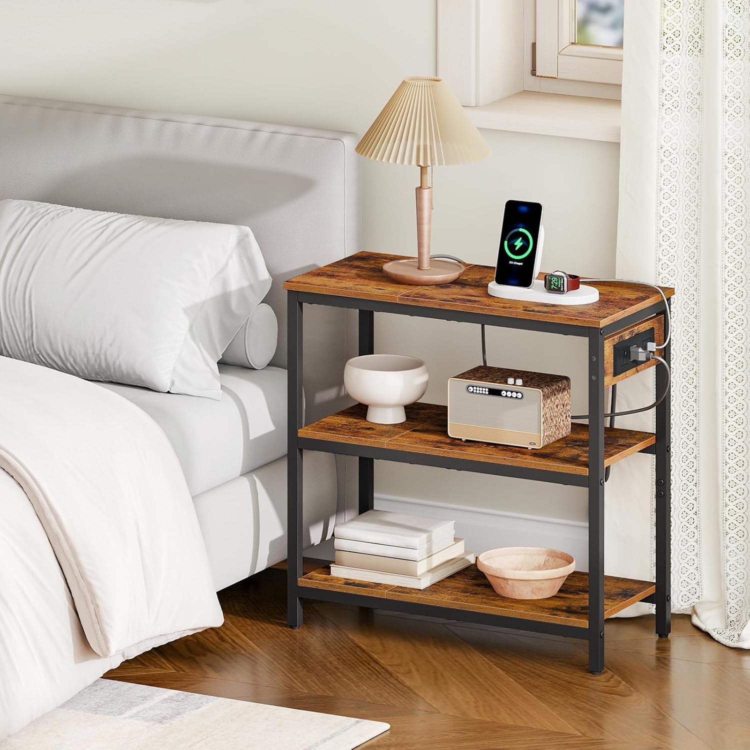 HOOBRO End Table with Charging Station, Simple Rustic Side Table with 3-Tier Storage Shelf, Narrow Nightstand for Small Spaces, for Living Room, Industrial Design, Rustic Brown and Black BF149UBZ01