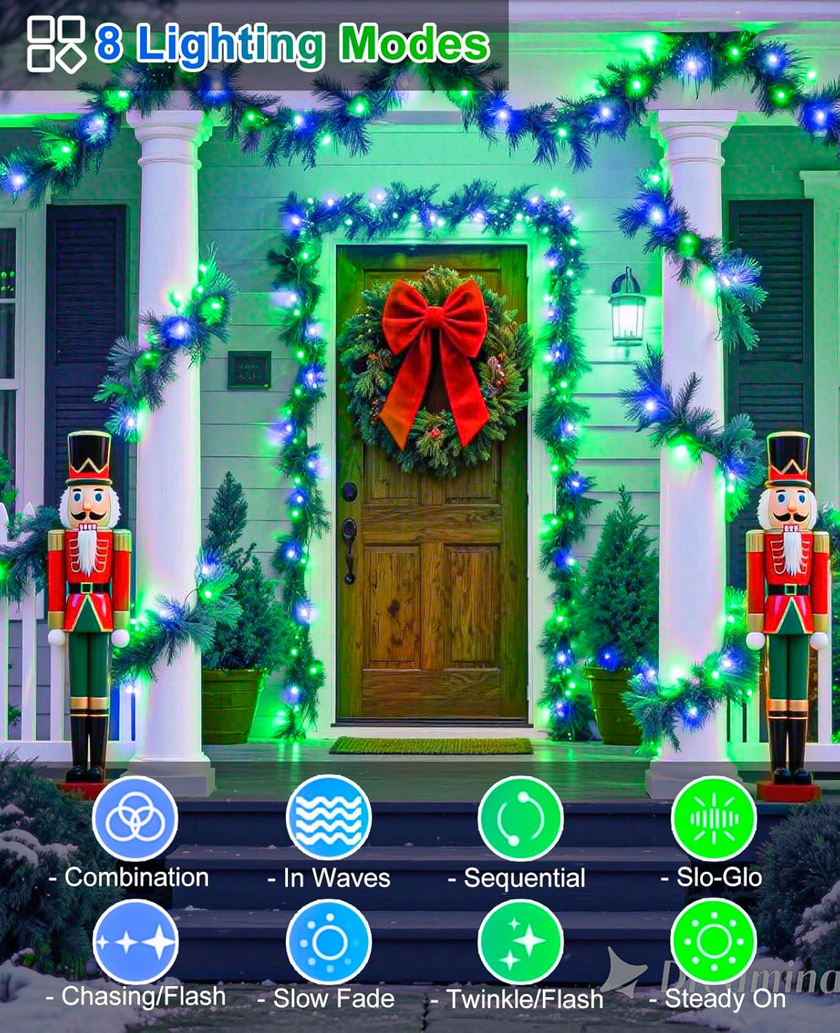 - 【8 Different Lighting Modes】These Christmas lights outdoor feature 8 lighting modes: combination, in waves, sequential, slo-glo, chasing/flash, slow fade, twinkle/flash, and steady on. Simply press the round button on the adapter to select your favorite mode. Perfect for creating a festive atmosphere and lighting up every corner with cozy, warm lights.