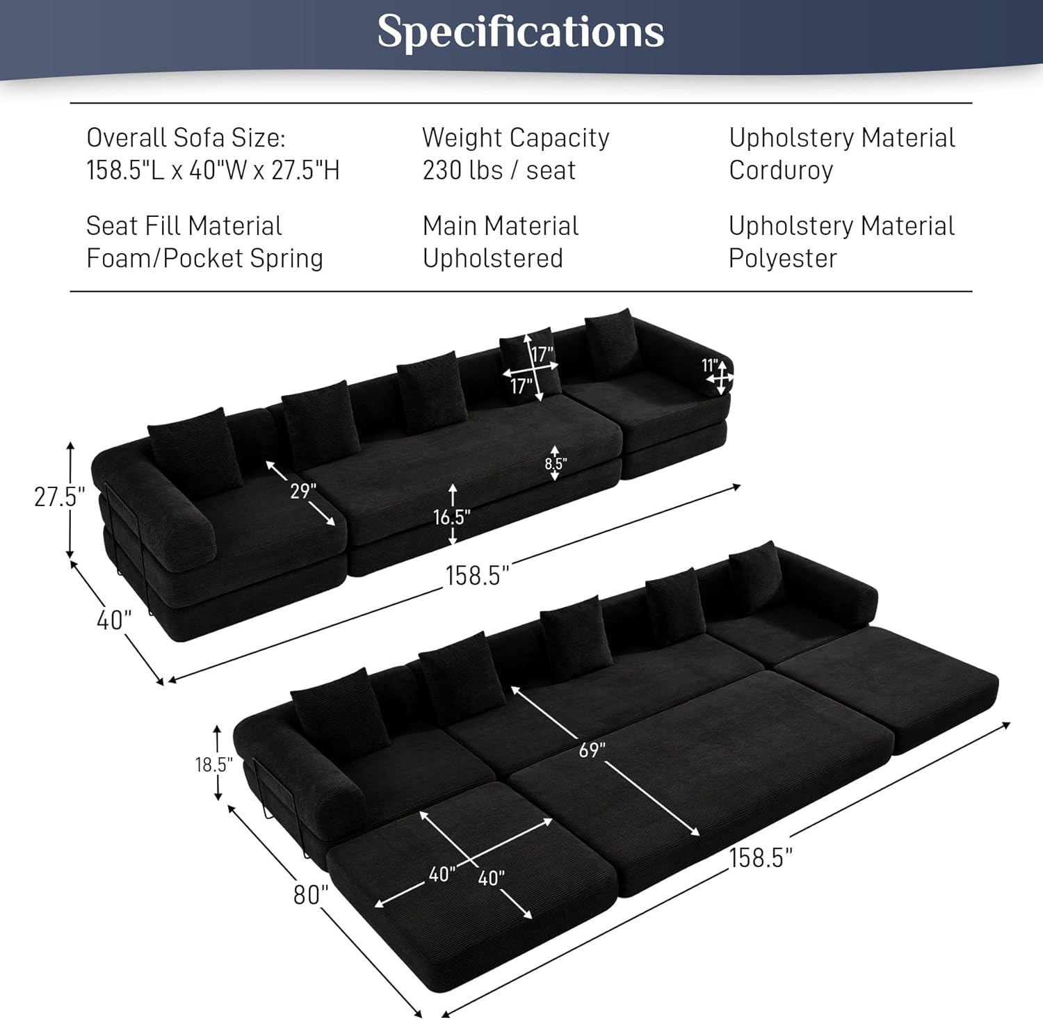 - Black Corduroy Boneless Couch with Generous Dimensions: With generous dimensions of 78.5"L x 37"W x 27"H as a sofa and 78.5"L x 74"W x 8.25"H when converted into a sleeper, this sofa bed queen offers ample space for lounging, sleeping, or entertaining guests. Its spacious design ensures that you and your guests enjoy optimal comfort, making vacuum sealed Boneless couch the perfect foldable sofa bed for any home.