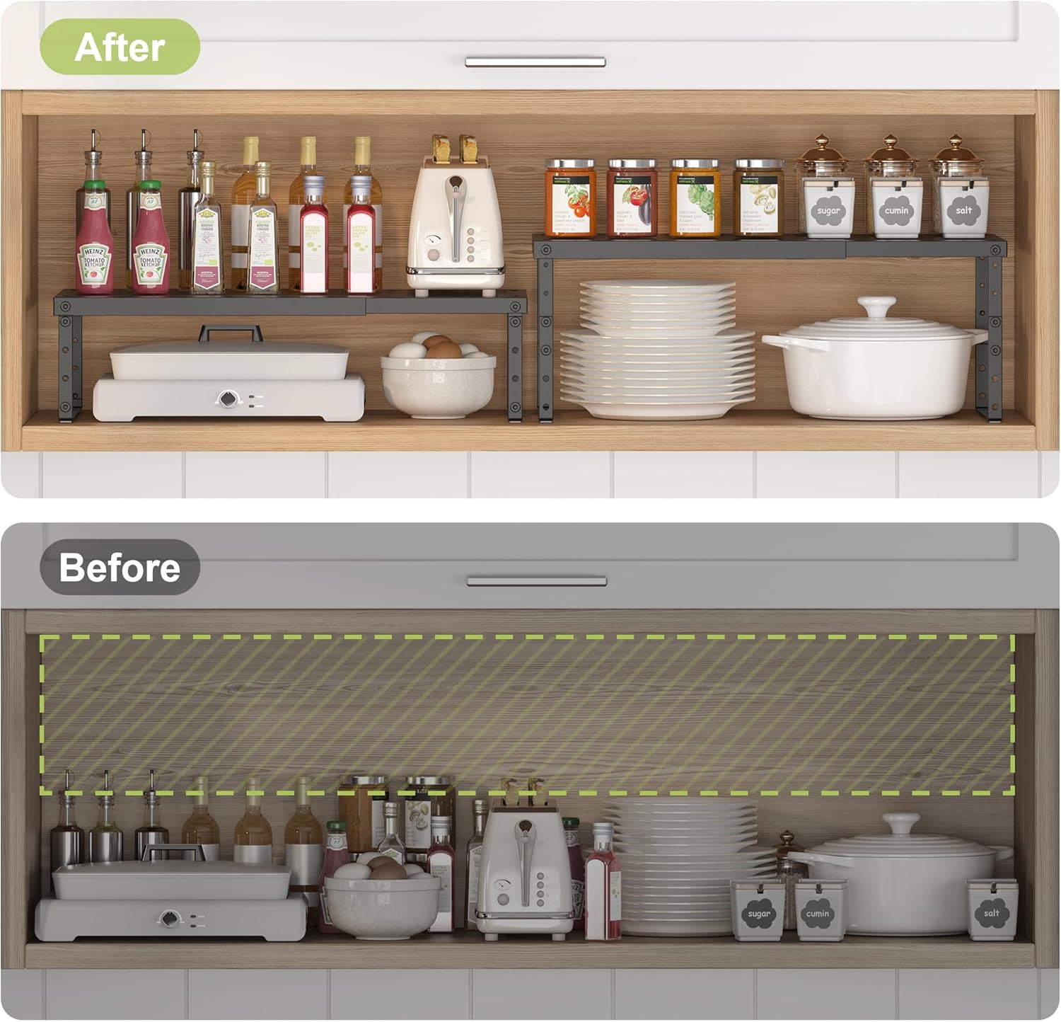 - 【Expandable Shelf Organizer】The length of cabinet shelf riser could be expandable from 14 to 22.4 inch to your desire, offers plenty of space for your kitchen essentials. This stackable pantry shelf rack can easily fit into a variety of different sizes of space. Extend sorage rack shelf to make full use of your space.