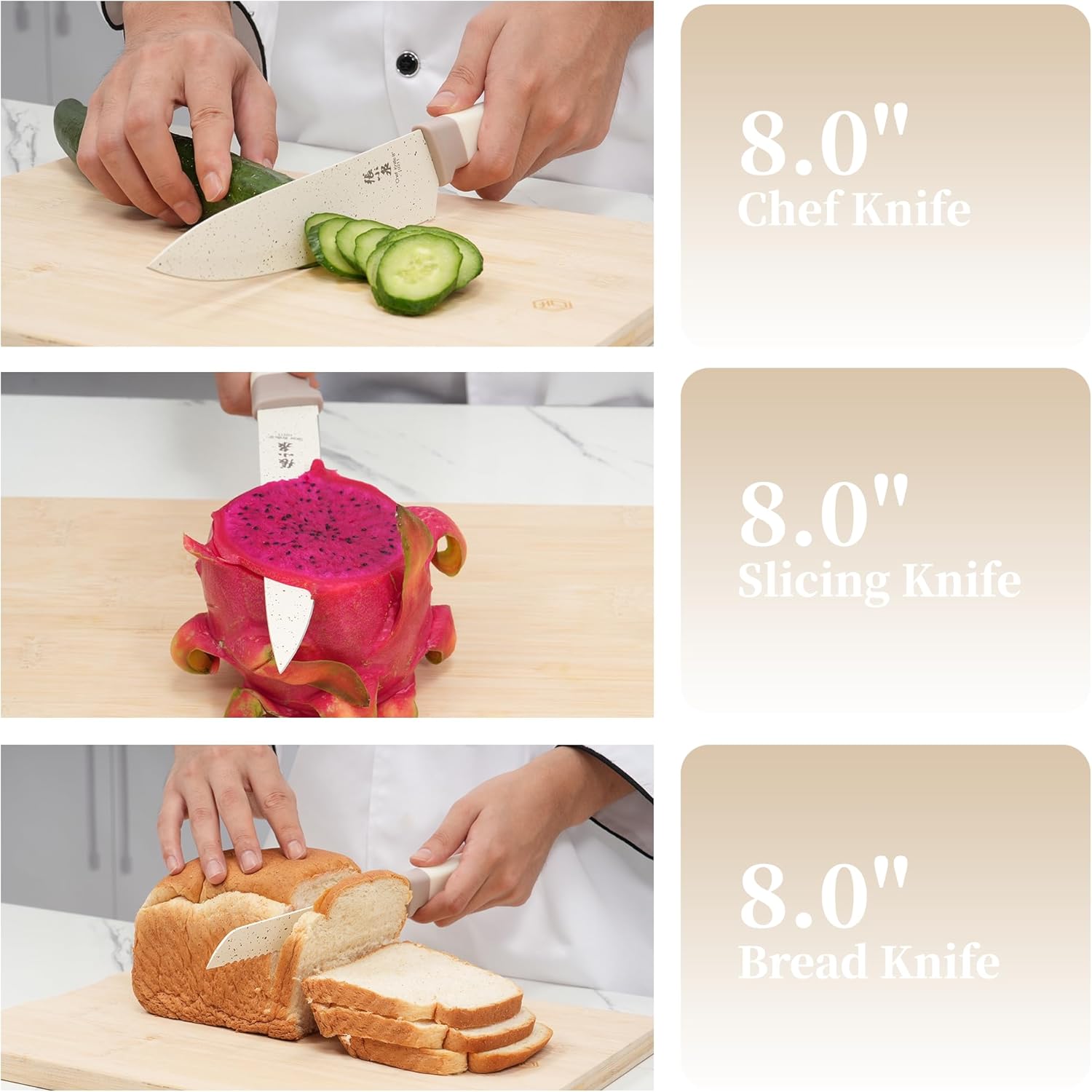 - 【HIGH-CARBON STAINLESS STEEL EXCELLENCE】 Our knife block set HRC 56-58 forged blades maintain razor-sharp edges 3x longer than standard knives. White ceramic-coated provides 360° corrosion resistance, outperforming traditional stainless steel by 68% in salt spray tests. Ideal for daily use or prolonged storage.