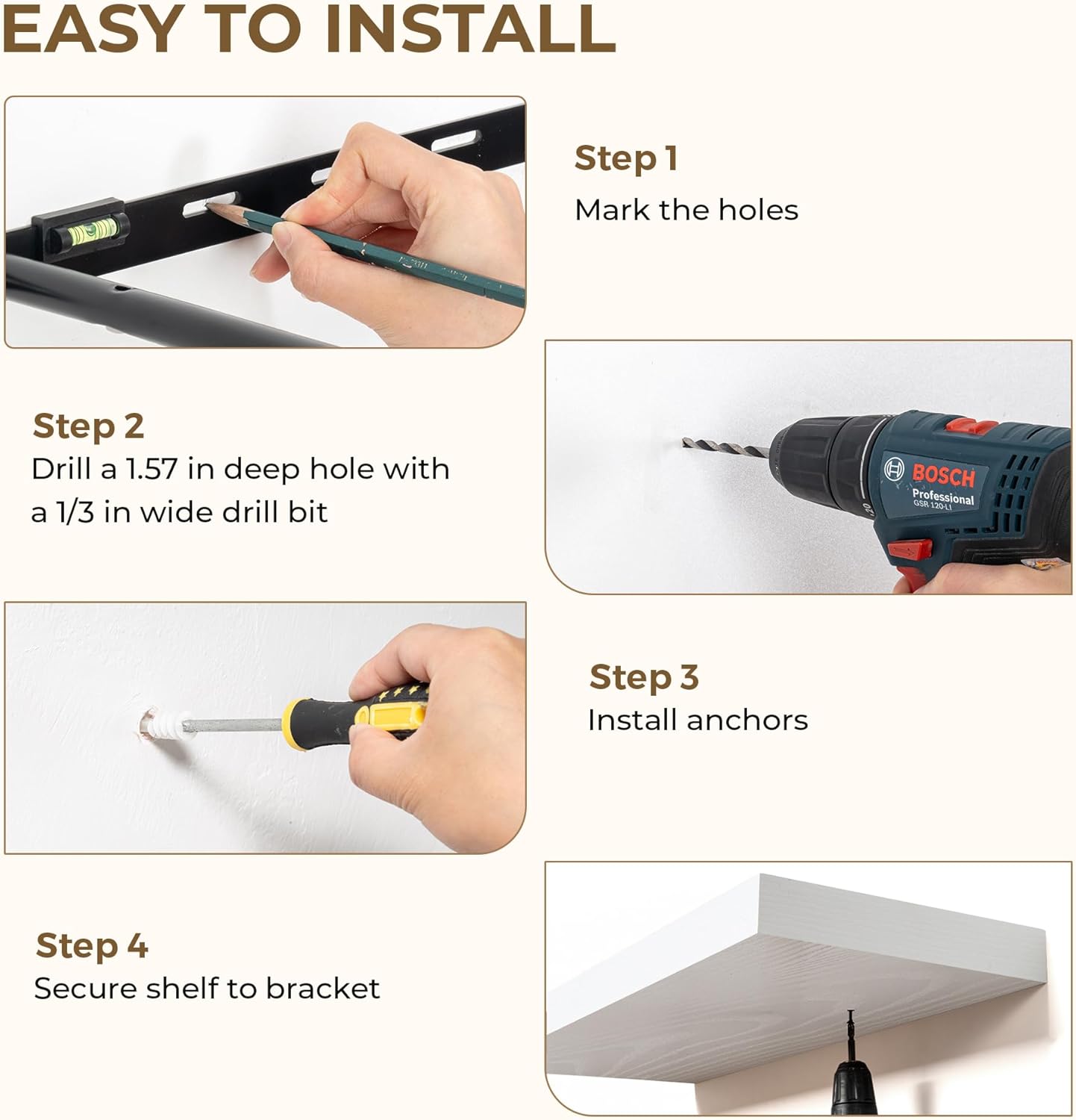 - Sturdy & Secure design: These 48-inch floating shelves feature a durable, concealed mounting bracket that offers reliable support for your belongings. Engineered for hassle-free and stable installation, each shelf includes all the required hardware to ensure a strong, wobble-free hold—perfect for showcasing your favorite decor, photos, or everyday items with confidence and style.