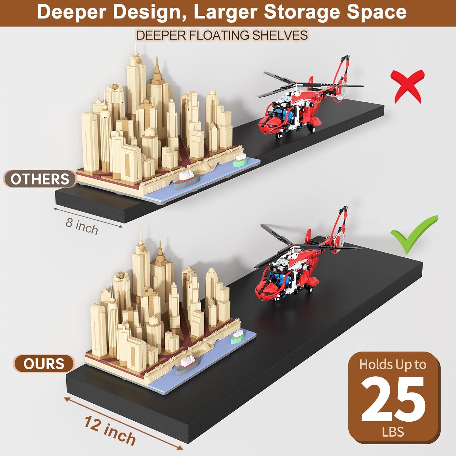 - ăExtra Deep 12" Storageă- These deep floating shelves for wall provide 12-inch depth for generous storage of books, decor, and kitchen essentials. Their expanded surface area maximizes organization while keeping items within easy reach. Perfect for displaying collectibles or storing daily necessities!