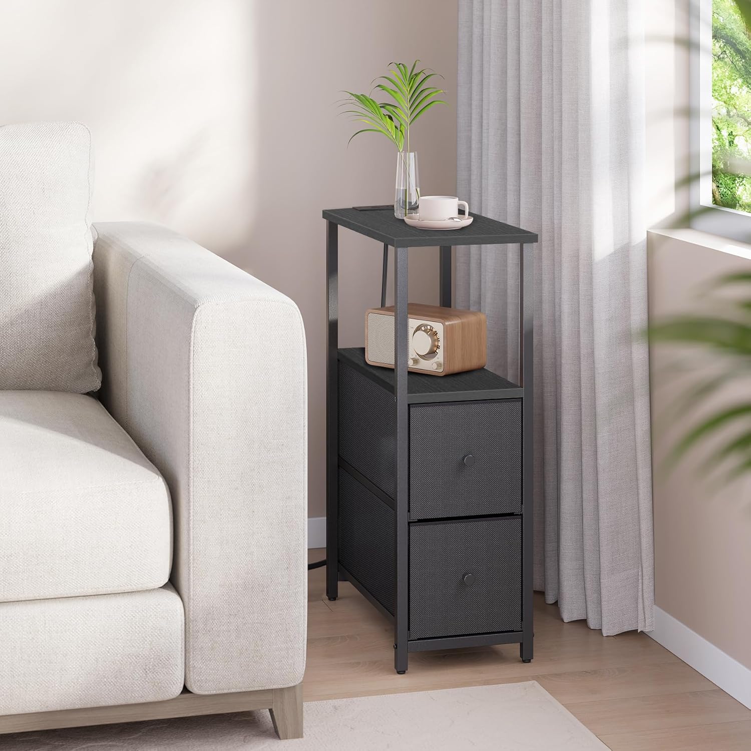 TUTOTAK Small Narrow LED End Table with Charging Station, Side Table Outlets, Nightstand with 2 Cloth Drawers, Couch Table, for Living Room, Bedroom, Bedside, Black TB01BK085L