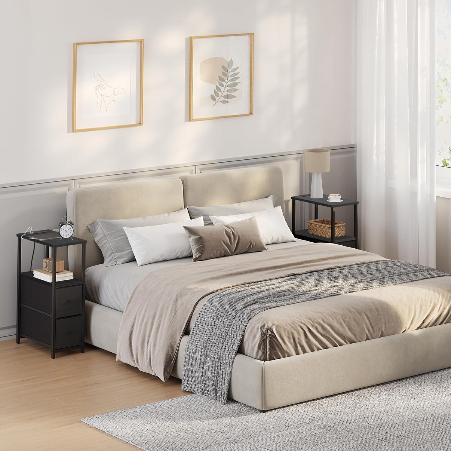 - [2 Fabrics Drawers] The bedroom nightstand has two open shelves for your magazines, boxes, and general living room knick-knacks, and 2 Fabric drawers for private stuff. The practical drawer easily goes in and out. It also arouses a guest’s curiosity.