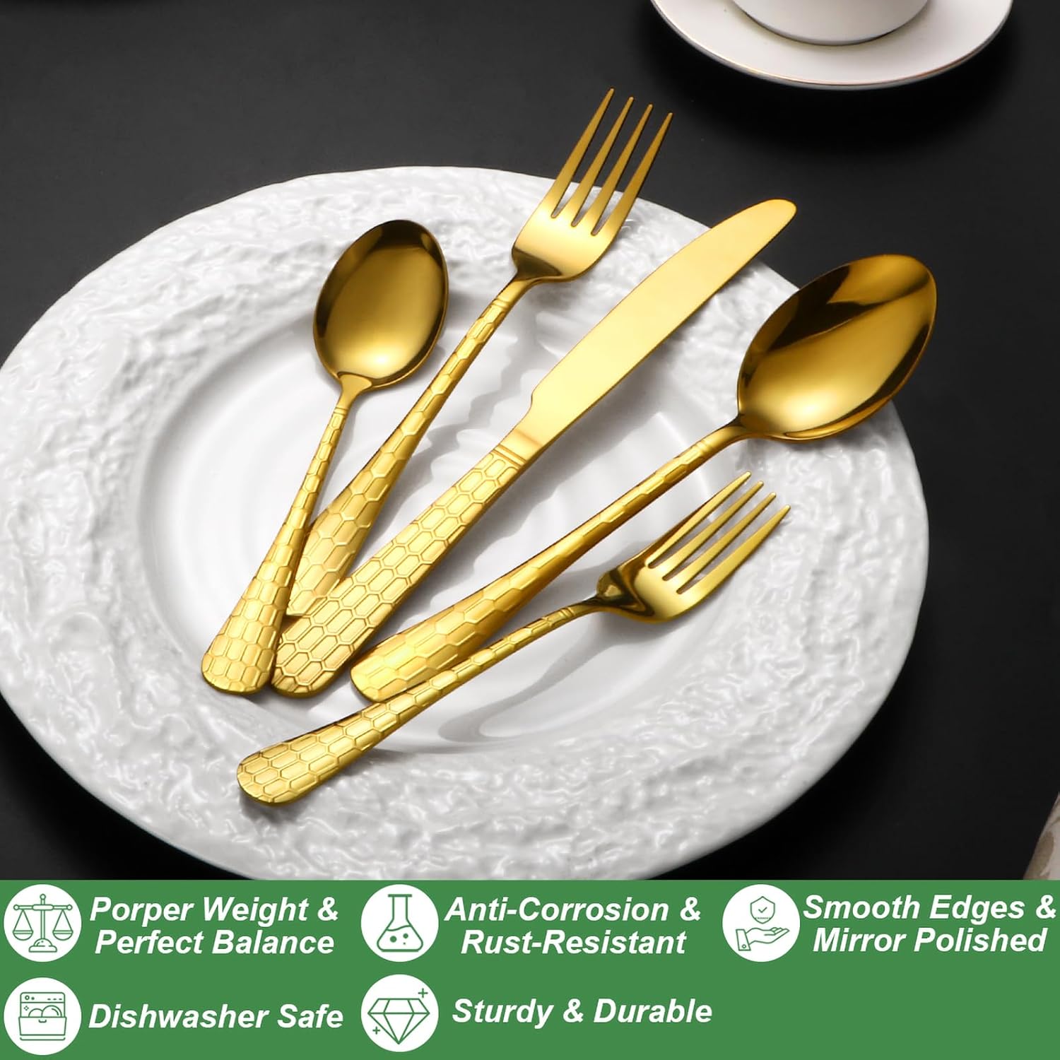 20 Pcs Gold Silverware Set for 4 with Water Cube Handle design, Food Grade Stainless Steel Flatware Set, Eating Utensils Sets Include Fork/Knife/Spoon, Reusable Cutlery Set, Dishwasher Safe