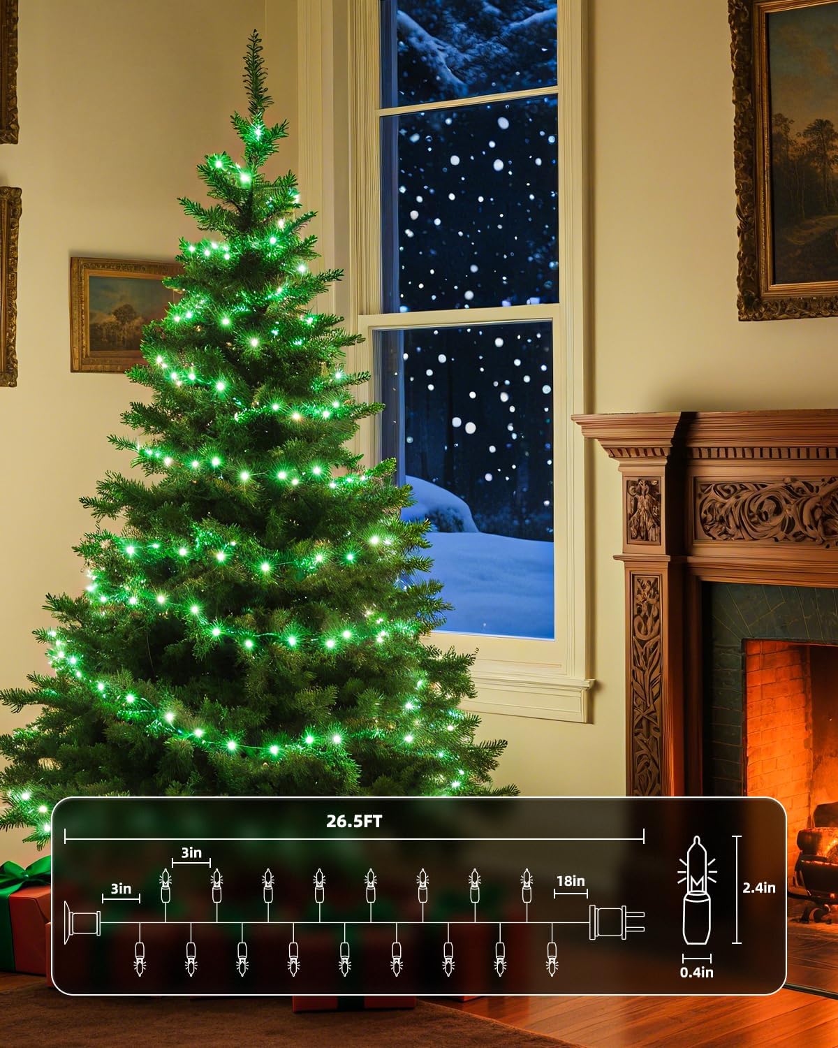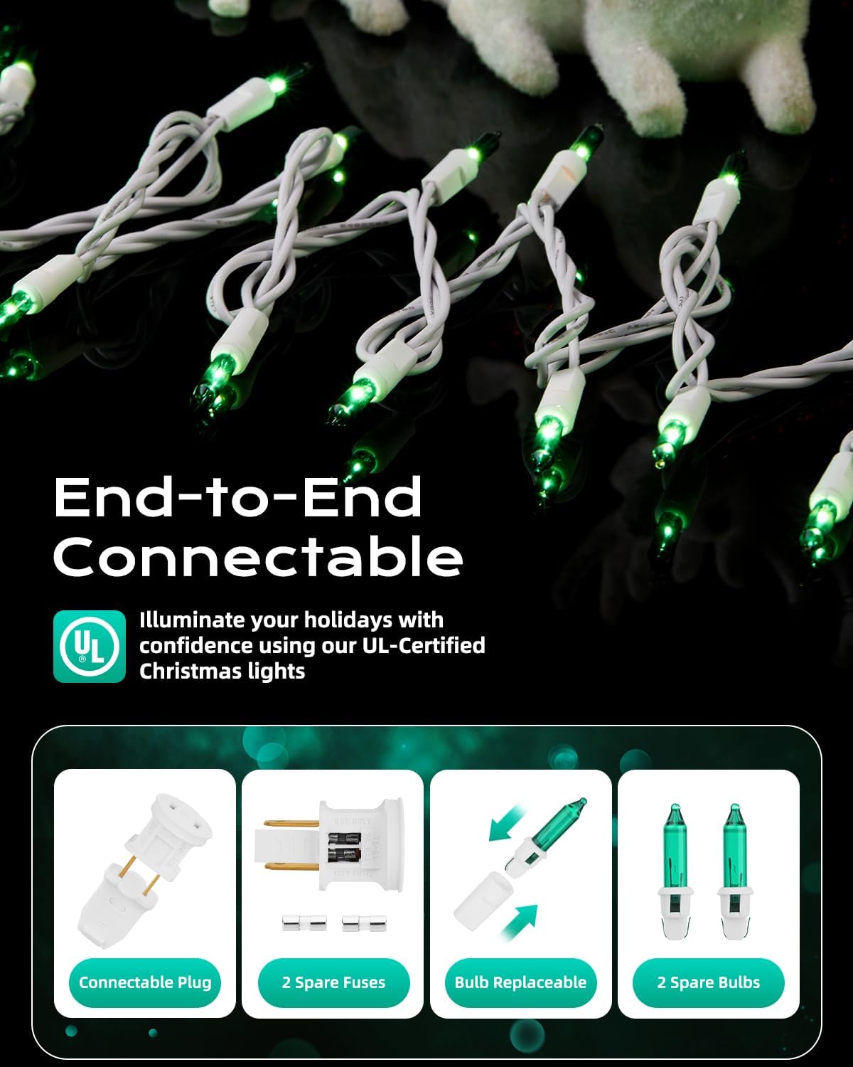 - 【Festive Mini Christmas Lights Set】This set includes 100 green incandescent mini-lights on 26.5 ft white wire, with bulbs spaced 3-inche apart and 18-inch lead wire. Perfect for holiday decorating, with the ability to connect up to 5 light strings end-to-end;
