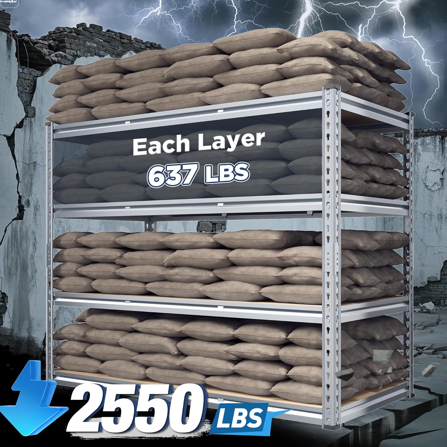 - ăGarage Shelving - 2550LBS CapacityăREIBII garage shelves are built like a tank! Thick steel legs and chunky boards can carry 637lbs on each shelf â that's 2550lbs total! Suit for stacking toolboxes, car parts, or even your camping gear. No wobbling, no bending, just rock-solid storage