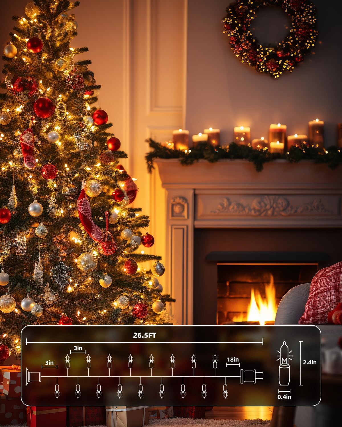 - 【Festive Mini Christmas Lights Set】This set includes 100 transparent incandescent mini-lights on 26.5 ft white wire, with bulbs spaced 3-inche apart and 18-inch lead wire. Perfect for holiday decorating, with the ability to connect up to 5 light strings end-to-end;