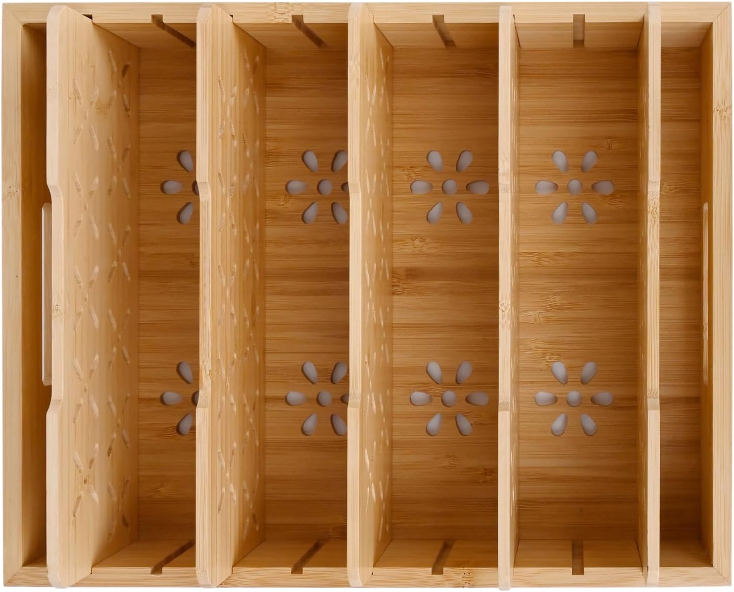- Customizable Compartments for Tidy Storage: Designed with 5 removable dividers and an open, flexible layout, this bamboo drawer organizer allows you to create compartments that fit your specific needs. Whether you're storing kitchen utensils, office supplies, or cosmetics, everything stays neat and easy to find. Say goodbye to clutter and enjoy smarter kitchen storage, deep drawer organization, and effortless access.