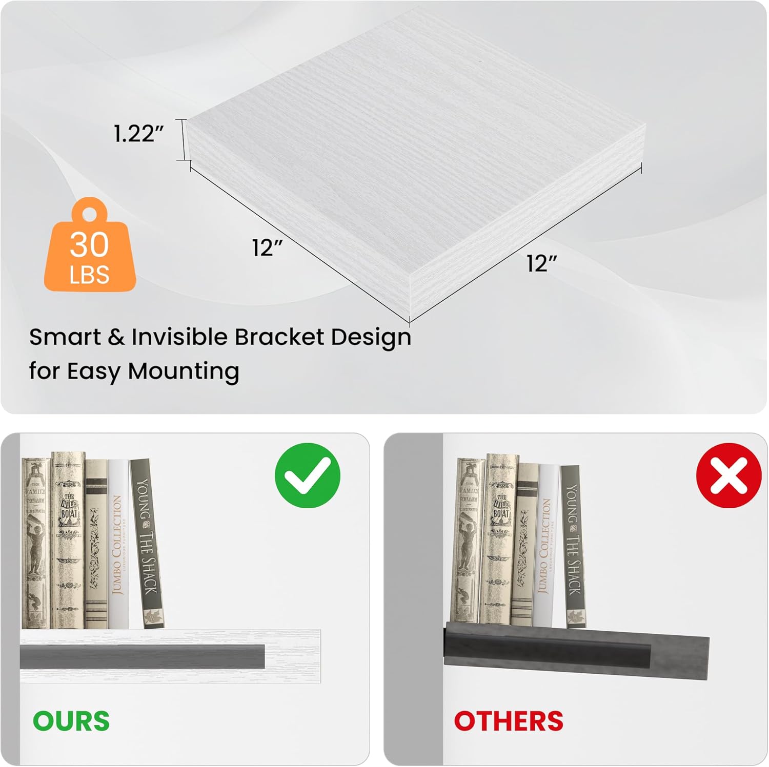 Square Floating Shelves for Wall, 12" W x 12" D x 1.2" H, Small Wooden Wall Mounted Display Shelves with Invisible Brackets for Living Room, Bedroom, Bathroom, Kitchen Decor, Set of 3, White