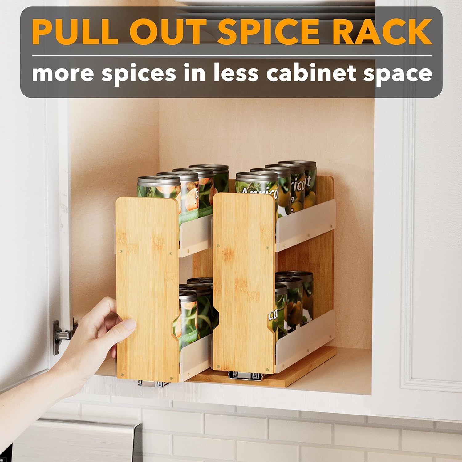 - DURABLE MATERIAL TO LAST - Crafted from premium quality bamboo, this slide out seasoning organizer is built for long-lasting use; Our space-saving spice rack complement your home storage system and maximize cabinet space efficiency
