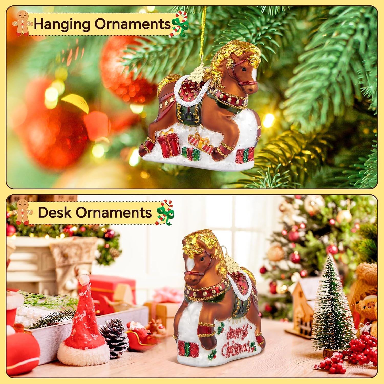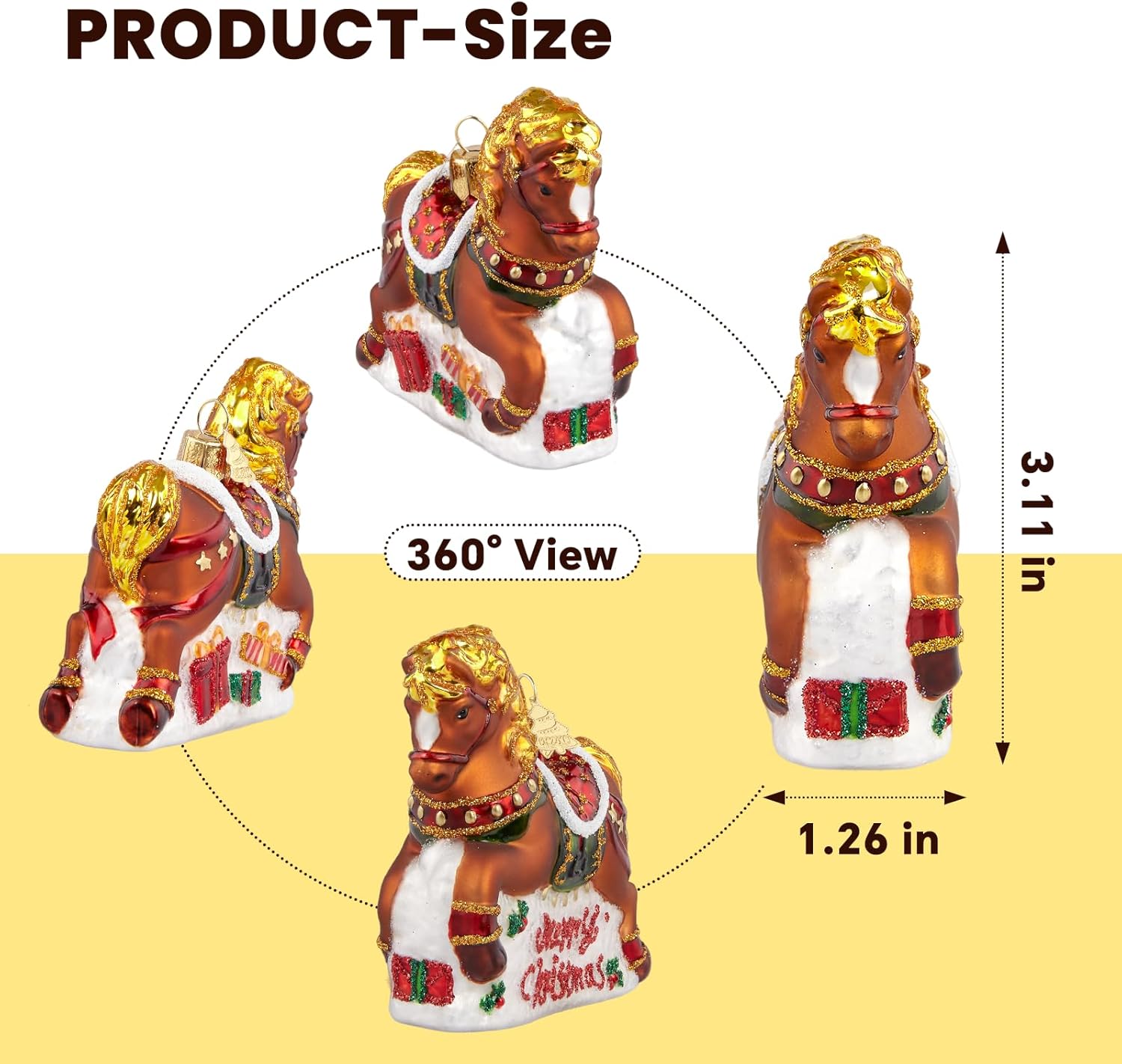 • High-Quality Material: The size of this Horse ornaments for Christmas tree is 3.11*1.26*3.27 in. Hand-blown glass christmas ornaments have a delicate and smooth surface, no pungent odor, are not easily damaged during natural use, and are easy to clean with a soft cloth