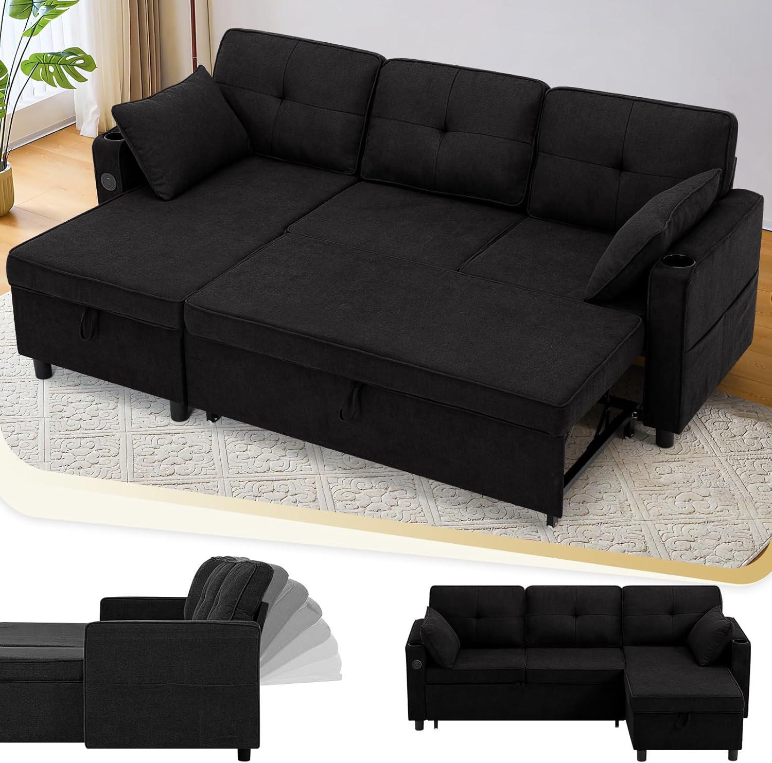 84 Inches Fabric Sectional Sofa w/Pull Out Sofa Bed & Adjustable Back, Tufted L Shaped Couch w/Storage Chaise, Sleeper Sectional Sofa w/USB Port & Cup Holders for Living Room, Black