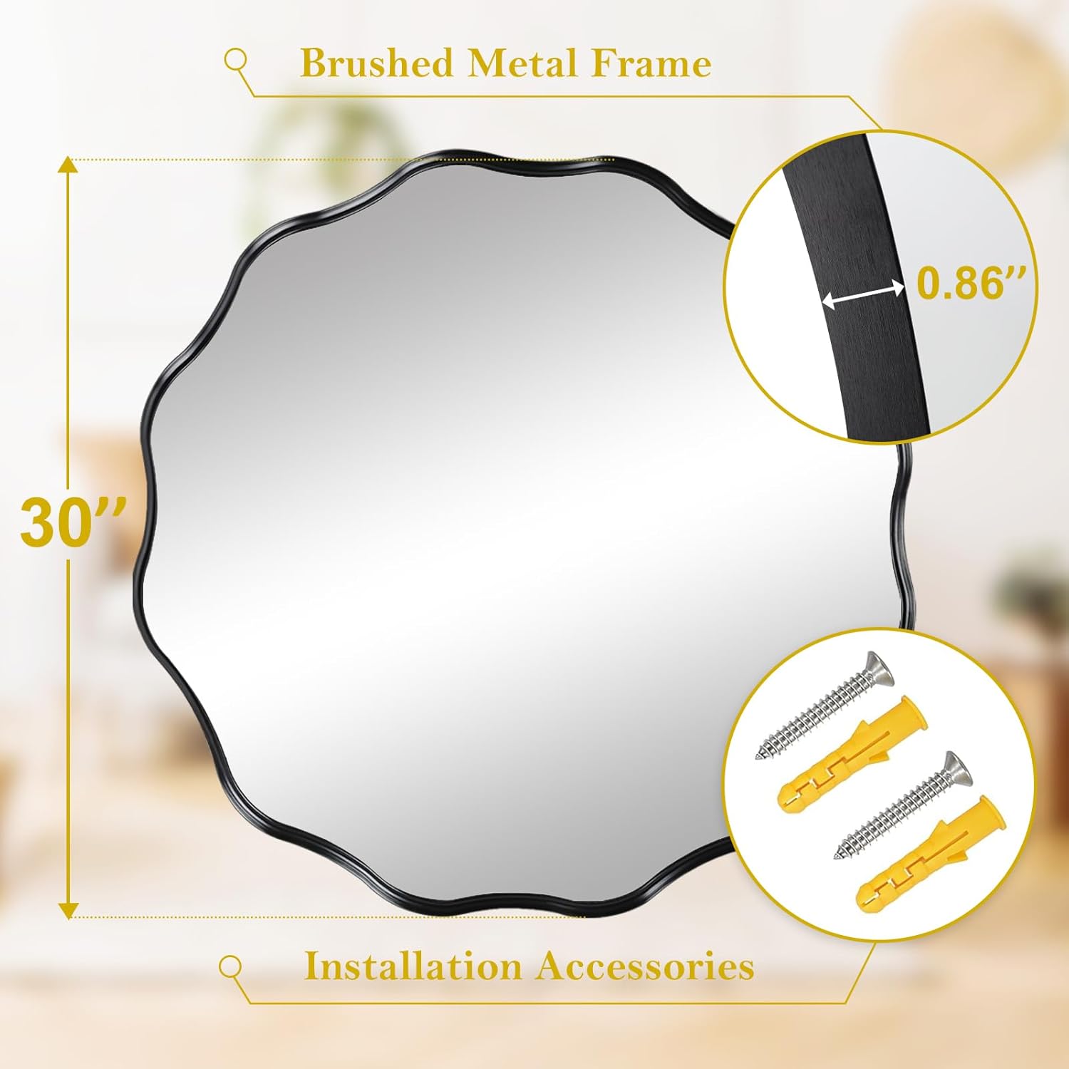Fabuady Black Round Wavy Edge Mirror - 30'' Circle Wall Mirror with Metal Frame, Decorative Hanging/Leaning Mirror for Bathroom, Bedroom, Living Room, Hallway, Entryway, Office, Home Decor