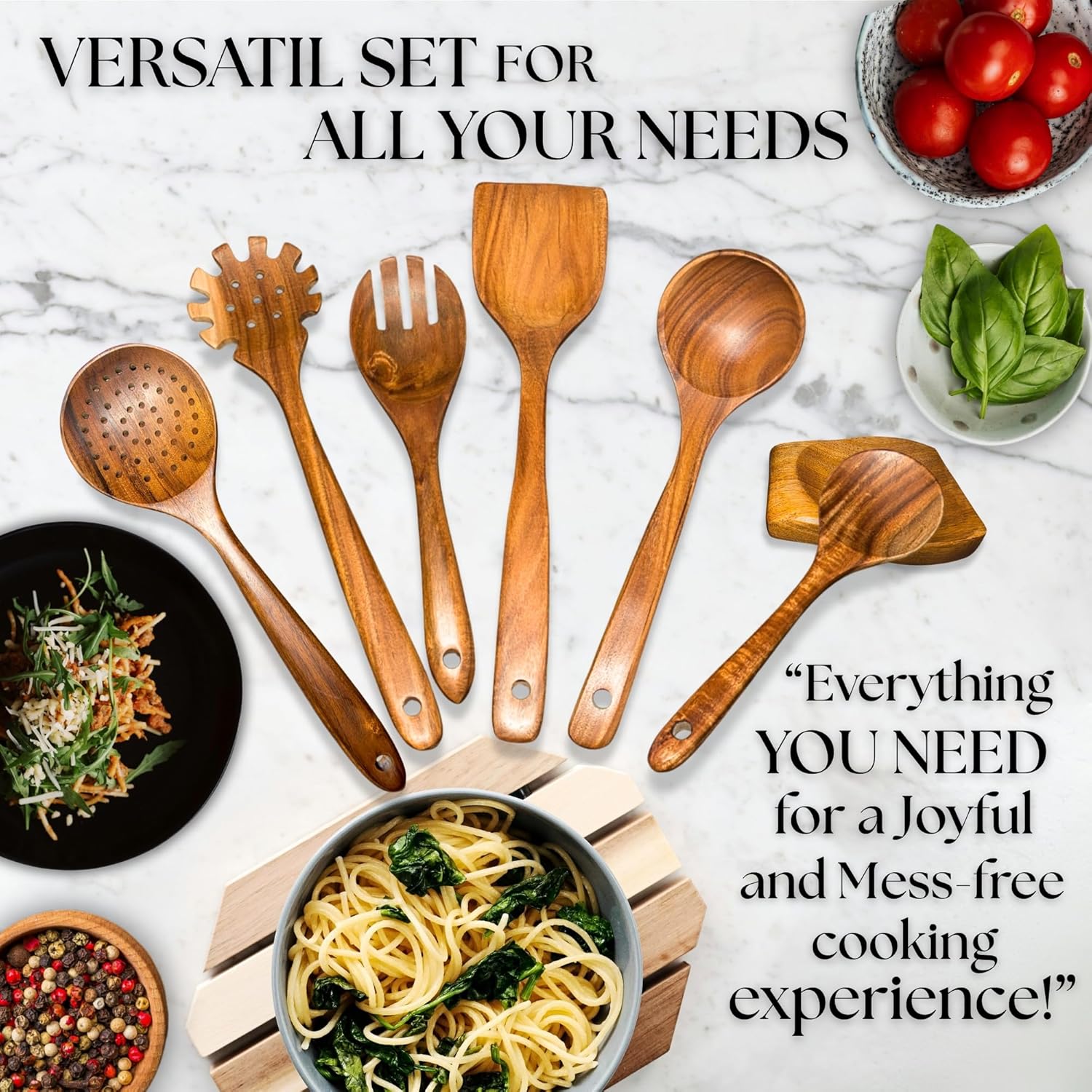 Wooden Spoons for Cooking - 8 Piece Natural Teak Kitchen Utensil Set Non Toxic - Teak Wooden Utensils with Spoon Rest and Holder