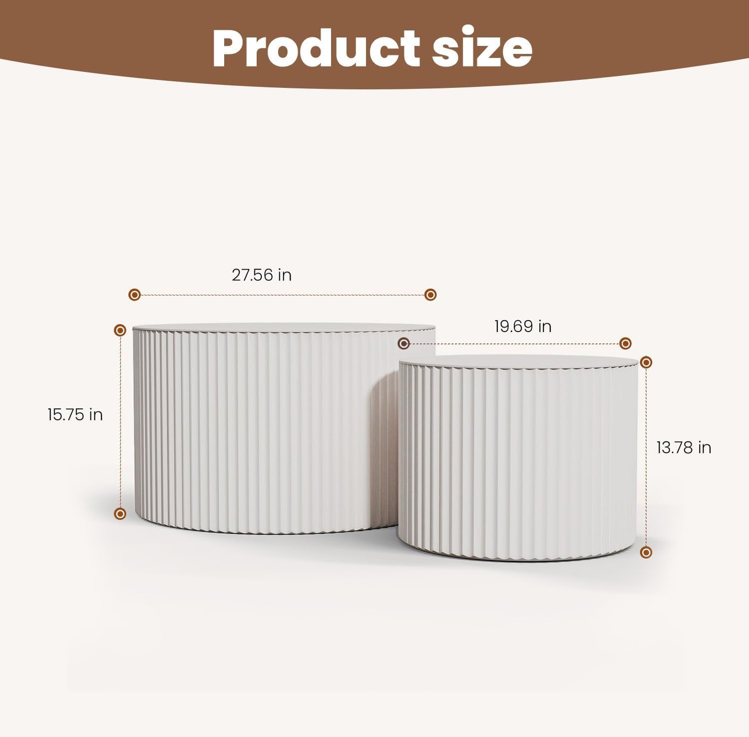 Round Nesting Coffee Table Wood Drum Nesting Tables Modern Stacking Coffee Table Set of 2 Fluted Center Table End Table for Living Room Home Office Small Spaces, No Assembling (Beige Large)