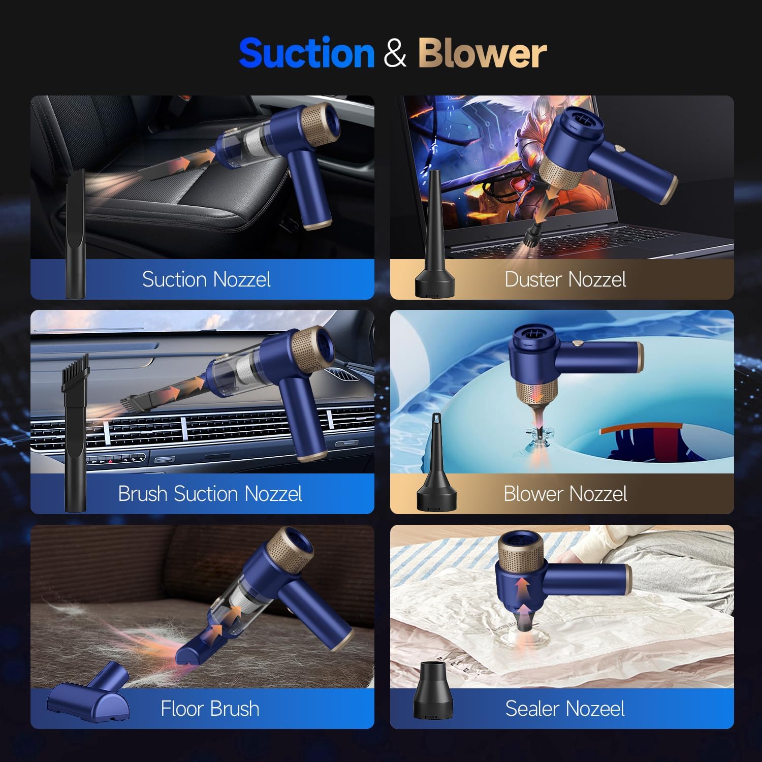 - ă7-in-1 Multifunctional Cordless Car Vacuum Cleaneră: The handheld vacuum cordless with 7 accessories supports multiple modes, such as vacuuming, blower, inflation, pump. Hand vacuum can meet different need for daily cleaning tasks and even clean hard-to-reach corners, such as blowing or vacuuming dust or debris from seats, keyboards, computer host, camera lenses and cabinet corners, or inflating or expeling air from swimming rings and mattresses, or Blow air for BBQ fire, etc