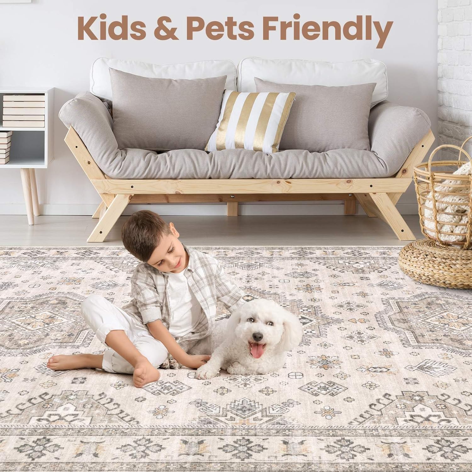 Washable Area Rugs for Living Room -10x12 Neutral Vintage Distressed Floral Farmhouse Boho Large Soft Floor Rug Indoor Non Slip Carpet for Living Room Bedroom Dining Room Office-Beige Brown