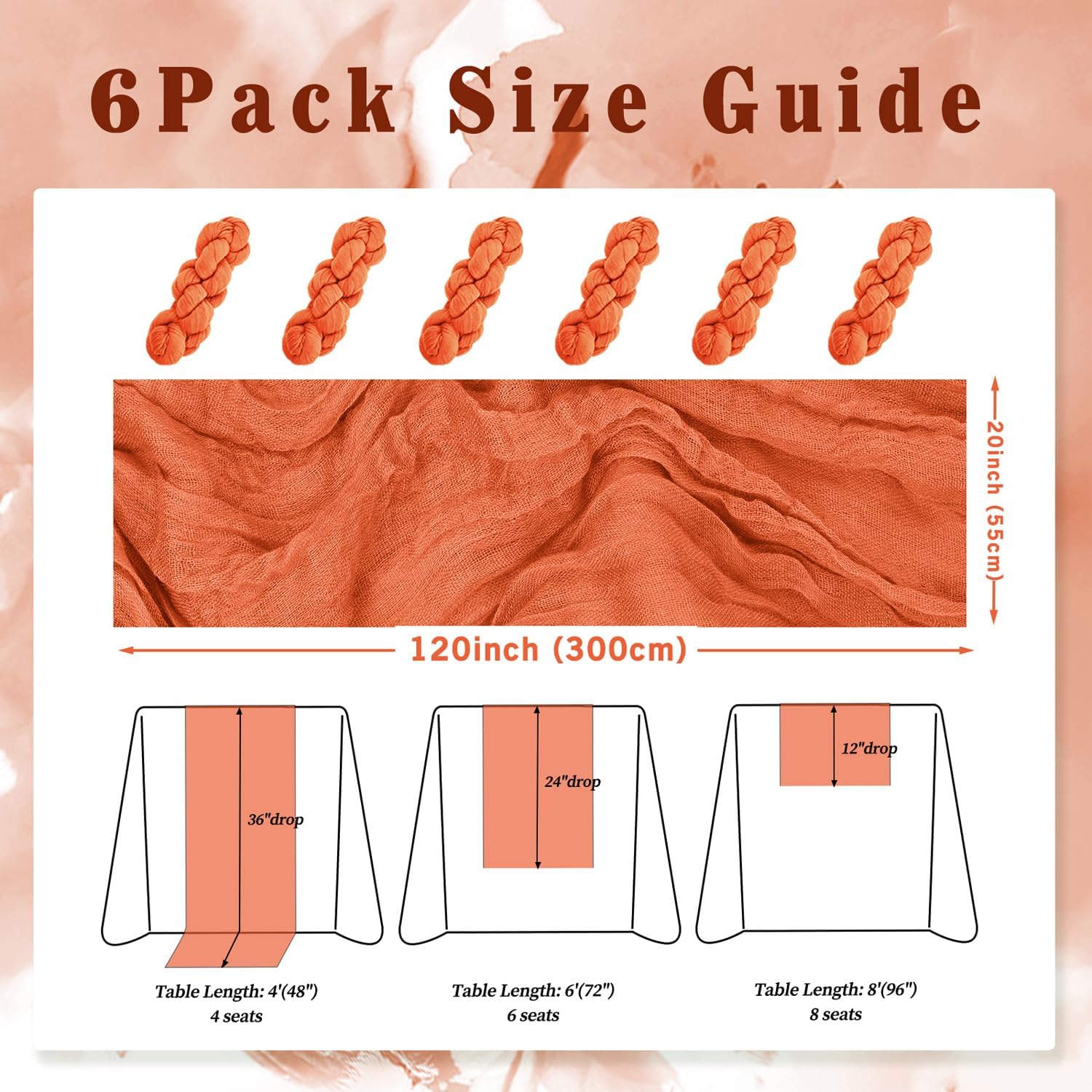 - Cheesecloth Table Runner Size: You will receive 6 orange cheesecloth tablerunner, each measuring 20 x 120 inches. The quantity is sufficient for you to decorate various romantic occasions. It can decorate most shaped tables, such as rectangular tables, round tables, and cocktail tables. It is long enough to decorate a large table and be placed perfectly and elegantly on the tabletop, adding a romantic atmosphere to your occasion.