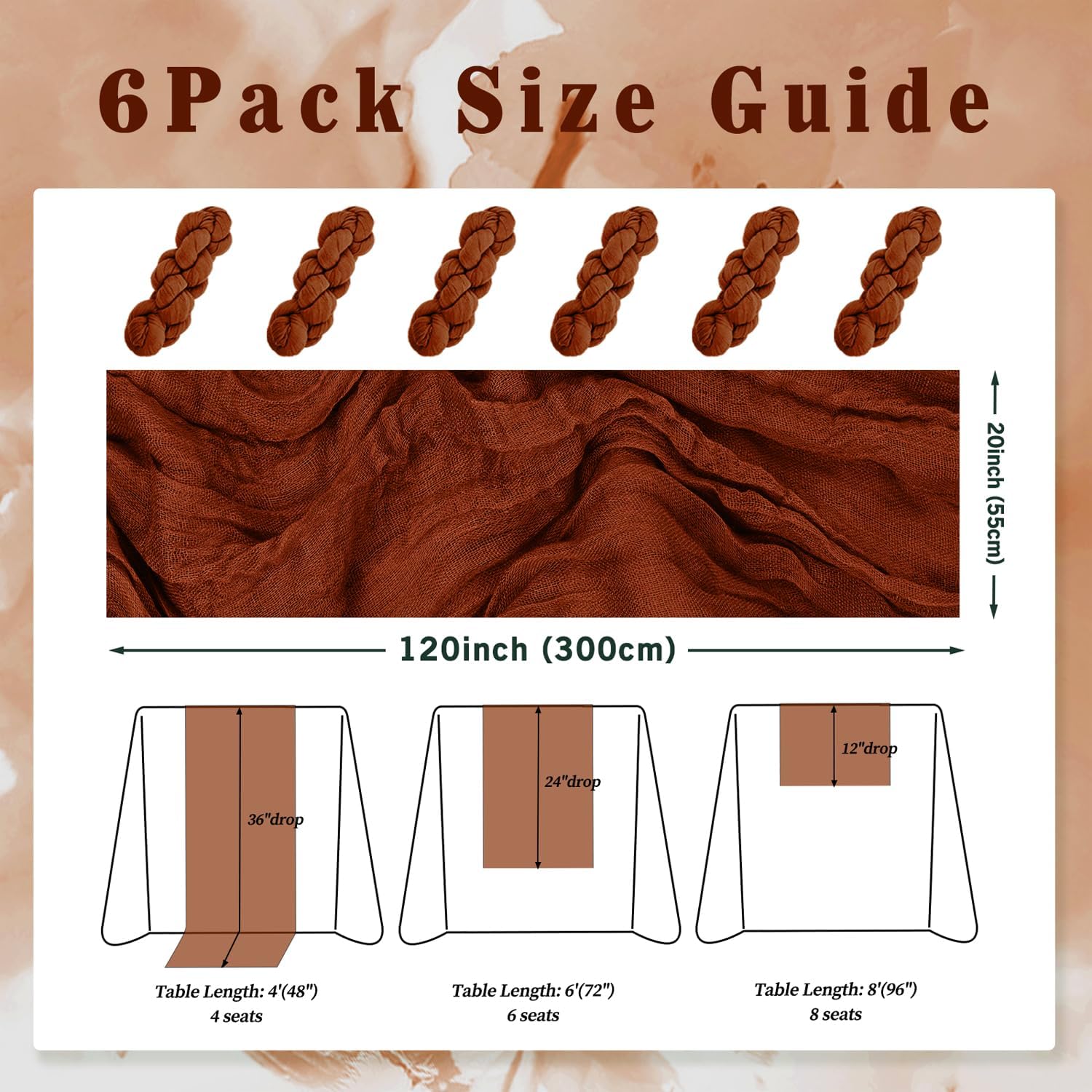 - Cheesecloth Table Runner Size: You will receive 6 terracotta cheesecloth tablerunner, each measuring 20 x 120 inches. The quantity is sufficient for you to decorate various romantic occasions. It can decorate most shaped tables, such as rectangular tables, round tables, and cocktail tables. It is long enough to decorate a large table and be placed perfectly and elegantly on the tabletop, adding a romantic atmosphere to your occasion.