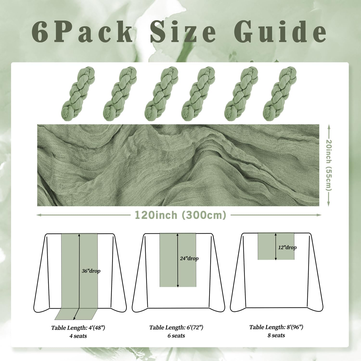 6 Pack Sage Green Cheesecloth Table Runner 10FT Rustic Gauze Fabric Cheese Cloth Table Runner for Wedding Bridal Baby Shower Table Decor 20 x 120 Inch Long Boho Sheer Birthday Party Table Decorations