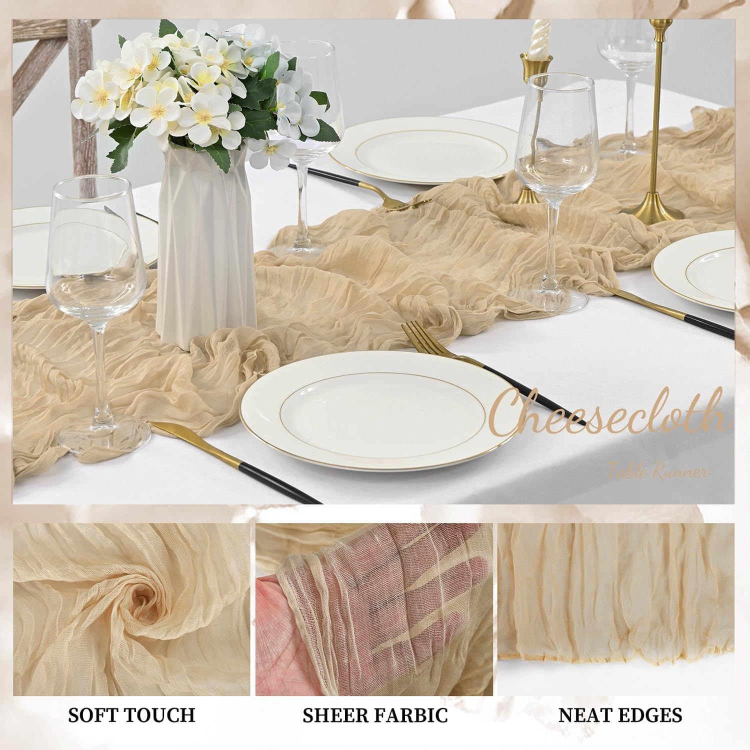- Cheesecloth Table Runner Size: You will receive 20 sand cheesecloth tablerunner, each measuring 20 x 120 inches. The quantity is sufficient for you to decorate various romantic occasions. It can decorate most shaped tables, such as rectangular tables, round tables, and cocktail tables. It is long enough to decorate a large table and be placed perfectly and elegantly on the tabletop, adding a romantic atmosphere to your occasion.