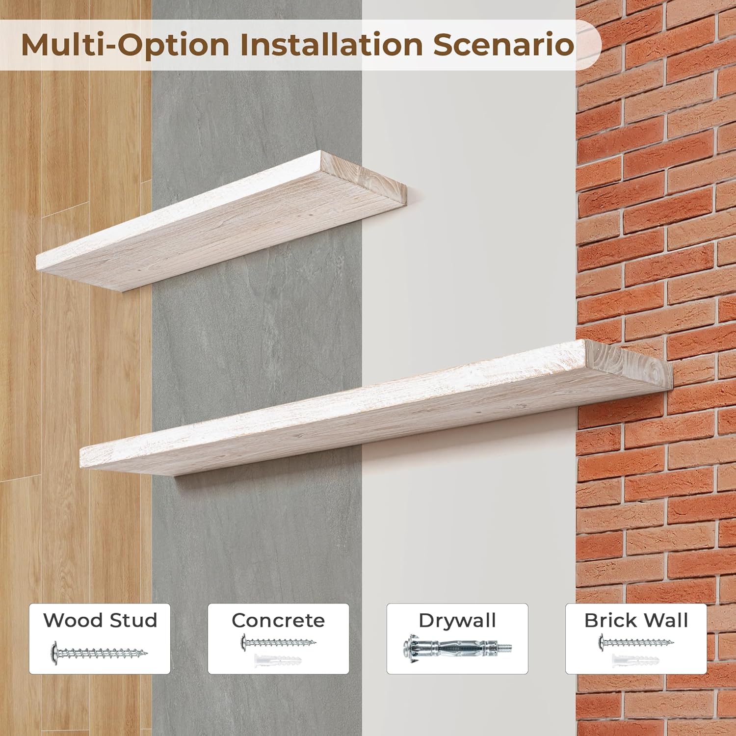 Axeman Floating Shelves for Wall - 40''W x 8'' D Rustic Solid Elm Wood Shelves for Storage, Wall Mounted Display Shelving with Invisible Heavy-Duty Metal Bracket (White Wash, 2PCs)